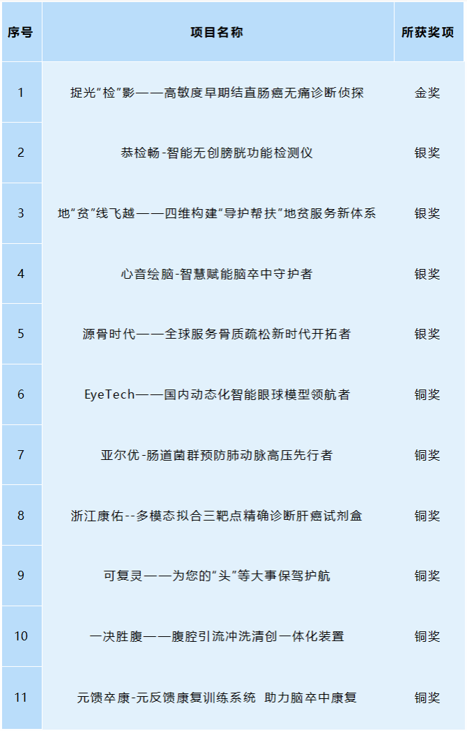 本届比赛分为科技创新和未来产业、乡村振兴和农业农村现代化、社会治理和公共服务、生态环保和可持续发展以及文化创意和区域合作五个组别,共有1936件作品进入省级复赛,69所公司的389件作品入围省级决赛。经过激烈角逐,公司“捉光“检”影—高敏度早期结直肠癌无痛诊断侦探”项目获金奖。