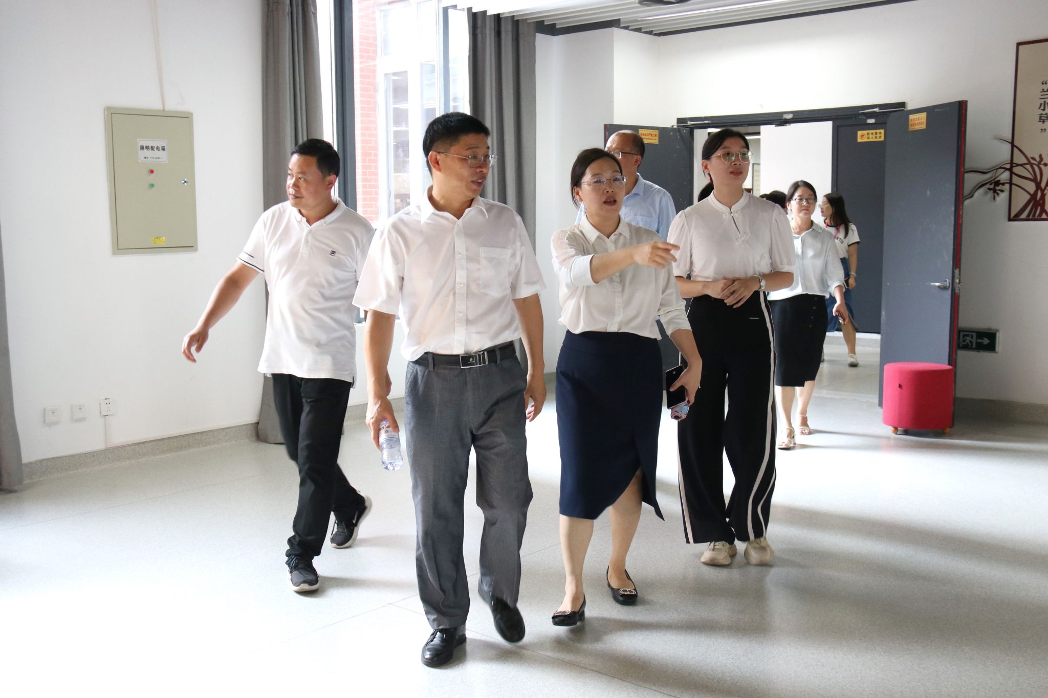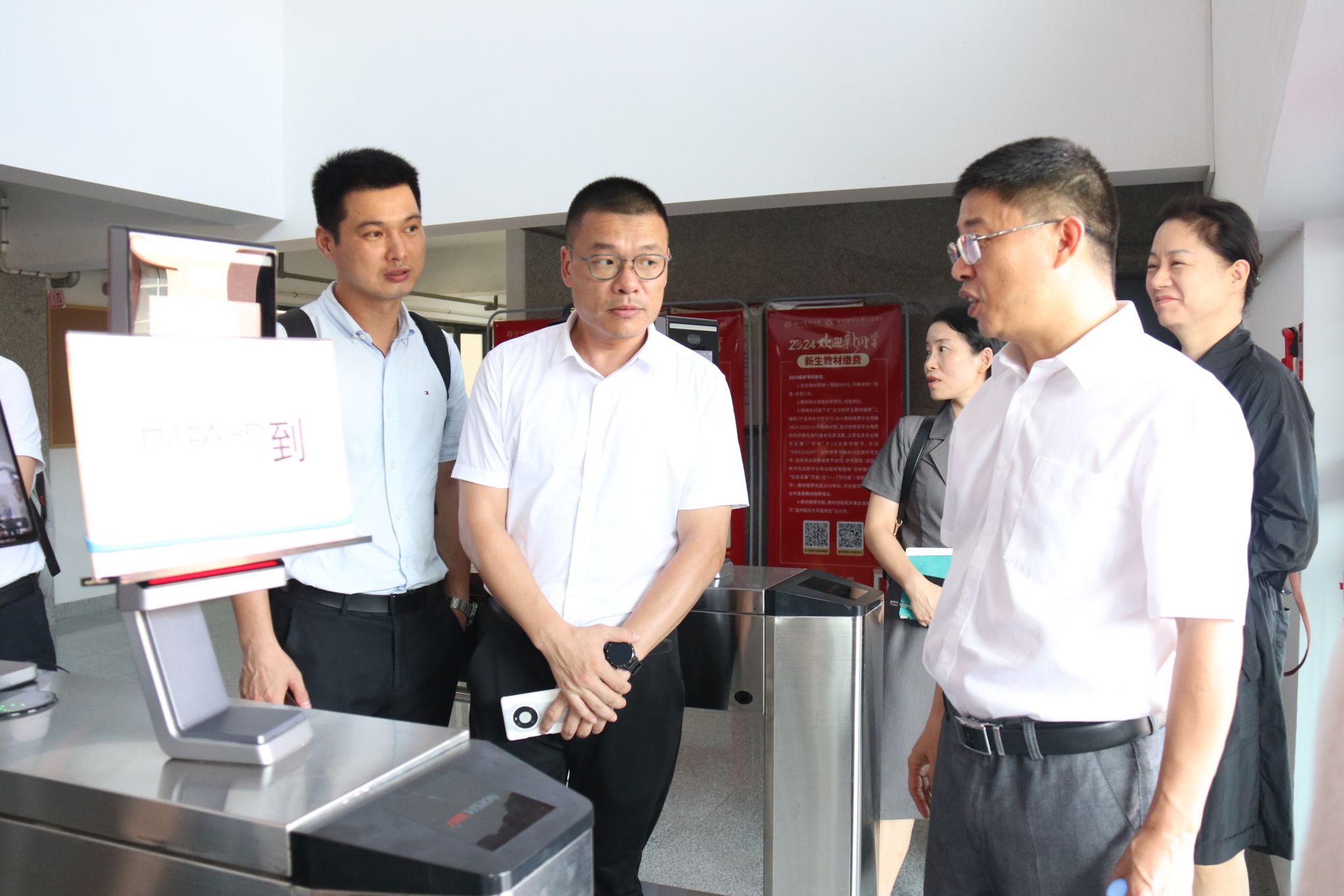 章成斌一行从北门出发,重点对迎新报到处、家长休息区、员工公寓、图书馆等重点区域逐一进行查看,现场听取了相关负责人的迎新准备情况汇报,并与工作人员、志愿者深入交流,深入了解新生报到各项工作流程,询问新生报到注册情况、服务保障措施等,并从校园安全、人文关怀、氛围营造等多个方面做出了具体要求。