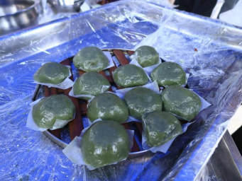员工们邀请了社区的宿管阿姨参与本次实践课堂,黄阿姨耐心地指导着她口中的“孩子们”放馅、包粿。正所谓“捣青草为汁,和粉做团,色如碧玉”,一团团黛绿映入眼帘,这一刻,便是春意盎然。