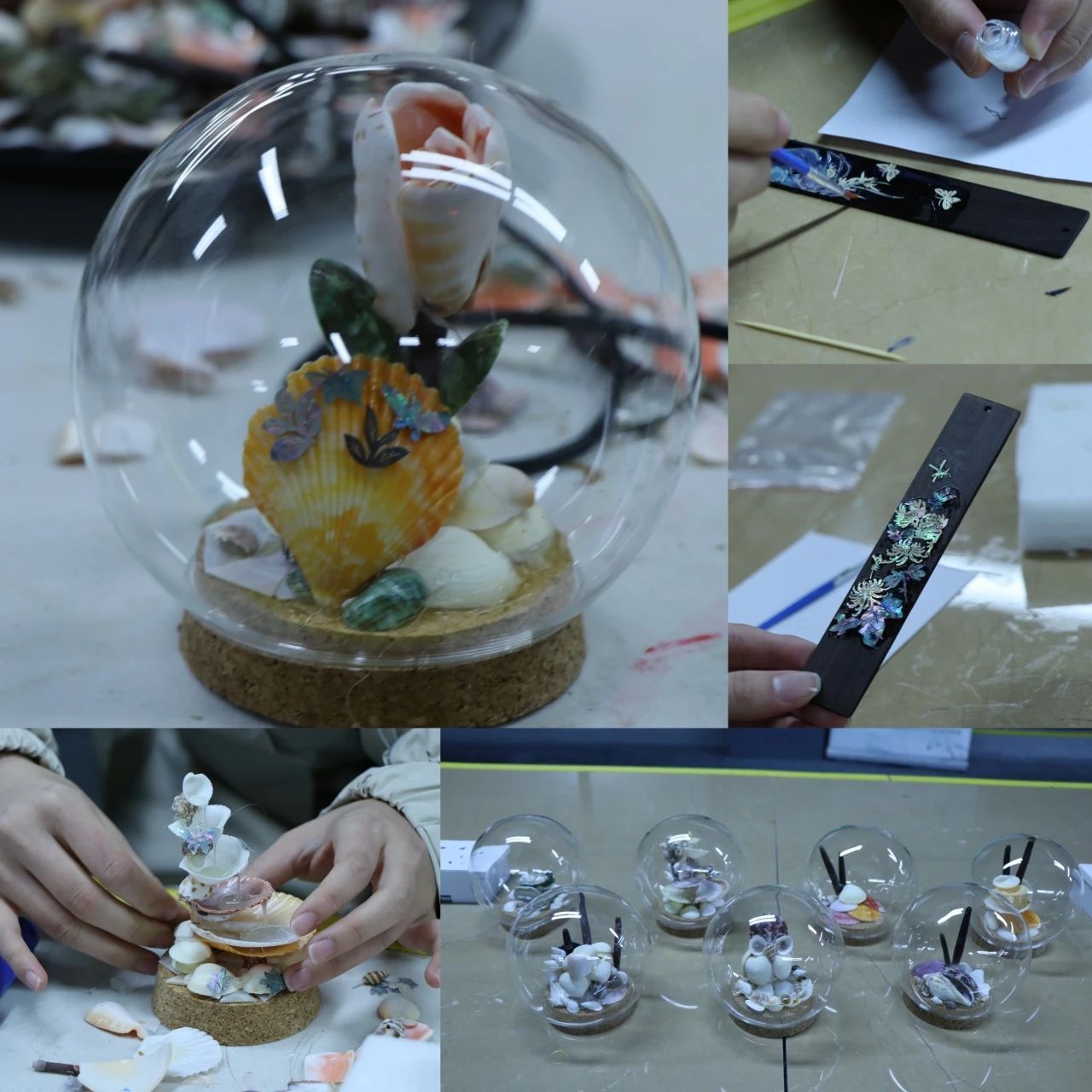 在东海贝雕艺术博物馆,学员们沉浸式感受省级非物质文化遗产——洞头贝雕的巧夺天工,详细了解其发展历程、技法演变及现代创新应用。在博物馆工作人员的指导下,学员们亲手体验贝堆造景、梅兰竹菊书签体验等工艺,感受海洋文化与工匠精神的深度融合。此次研学活动中,曾担任一年多贝雕博物馆讲解志愿者的朱同学表示:"再次回到贝雕博物馆倍感亲切,希望更多的游客能够来到贝雕博物馆,了解贝雕螺钿工艺的发展历史及精美工艺,让螺钿技艺既能传承发扬,又能创新发展。"