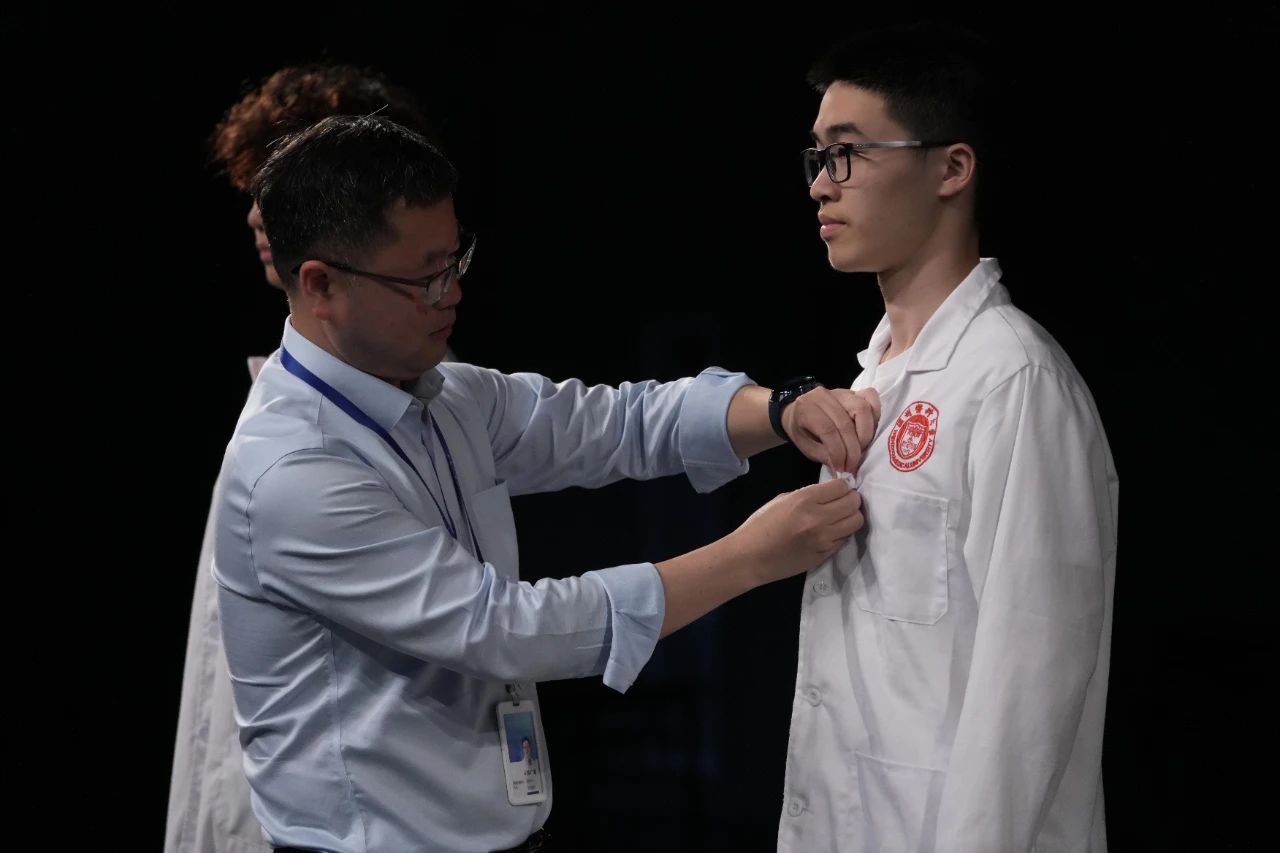 4月19日,在K1体育滨海校区的竖医冠仪式活动将系列活动推向高潮。仪式上春晖青年志愿者服务中心原创情景剧《生命的奇迹》,艺术再现"兰小草"匿名行医十五载的动人故事;温医大医管处副处长、温医大附一院急诊科洪广亮教授结合救治案例,阐释"德术并重"的现代内涵;随后,洪老师为医员工代表扣上白大褂上的第一颗纽扣,寄托了他对医学新生的殷切嘱托和期望。最后,全体医员工在医学誓言宣誓中完成身份转化,洁白医袍与青春誓言交相辉映,勾勒出新时代医员工的精神图谱。