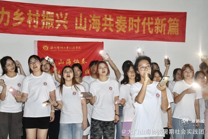 实践期间,台风“丹娜丝”侵袭洞头。实践团所驻大门新城实验公司成为避灾安置点,接收了133名转移群众。面对突发状况,38名实践队员迅速行动,化身全能志愿者:协助分发物资、疏导情绪;发挥专业所长,开设临时健康角提供健康服务;更在风雨交加之夜,克服困难,用手机灯光搭建星光舞台,为安置群众献上了一场充满温情的即兴演唱会。《小幸运》《晴天》等熟悉的旋律驱散了不安,歌声与关怀焐热了133颗悬着的心,生动展现了新时代青年在关键时刻的责任与担当。