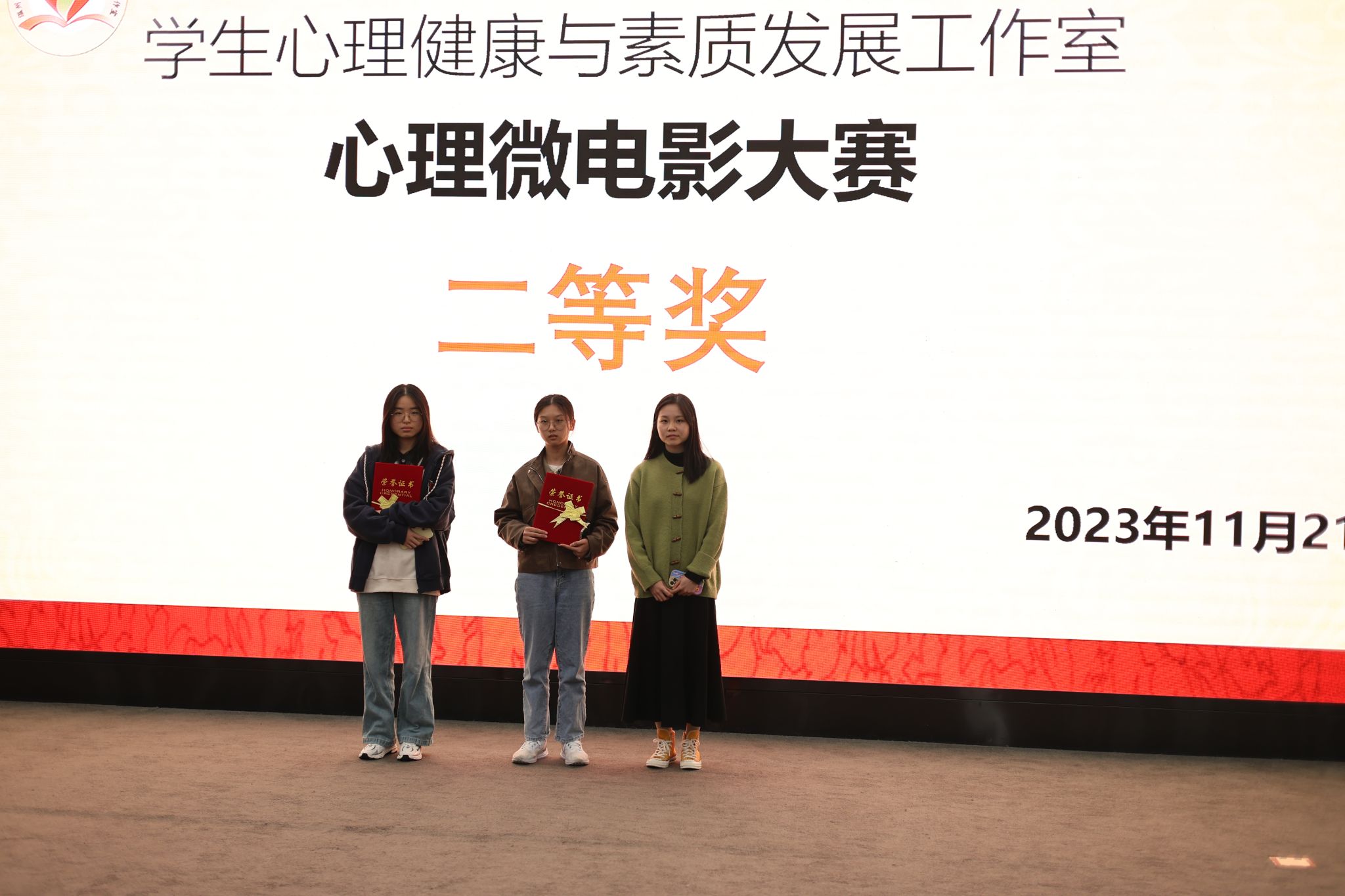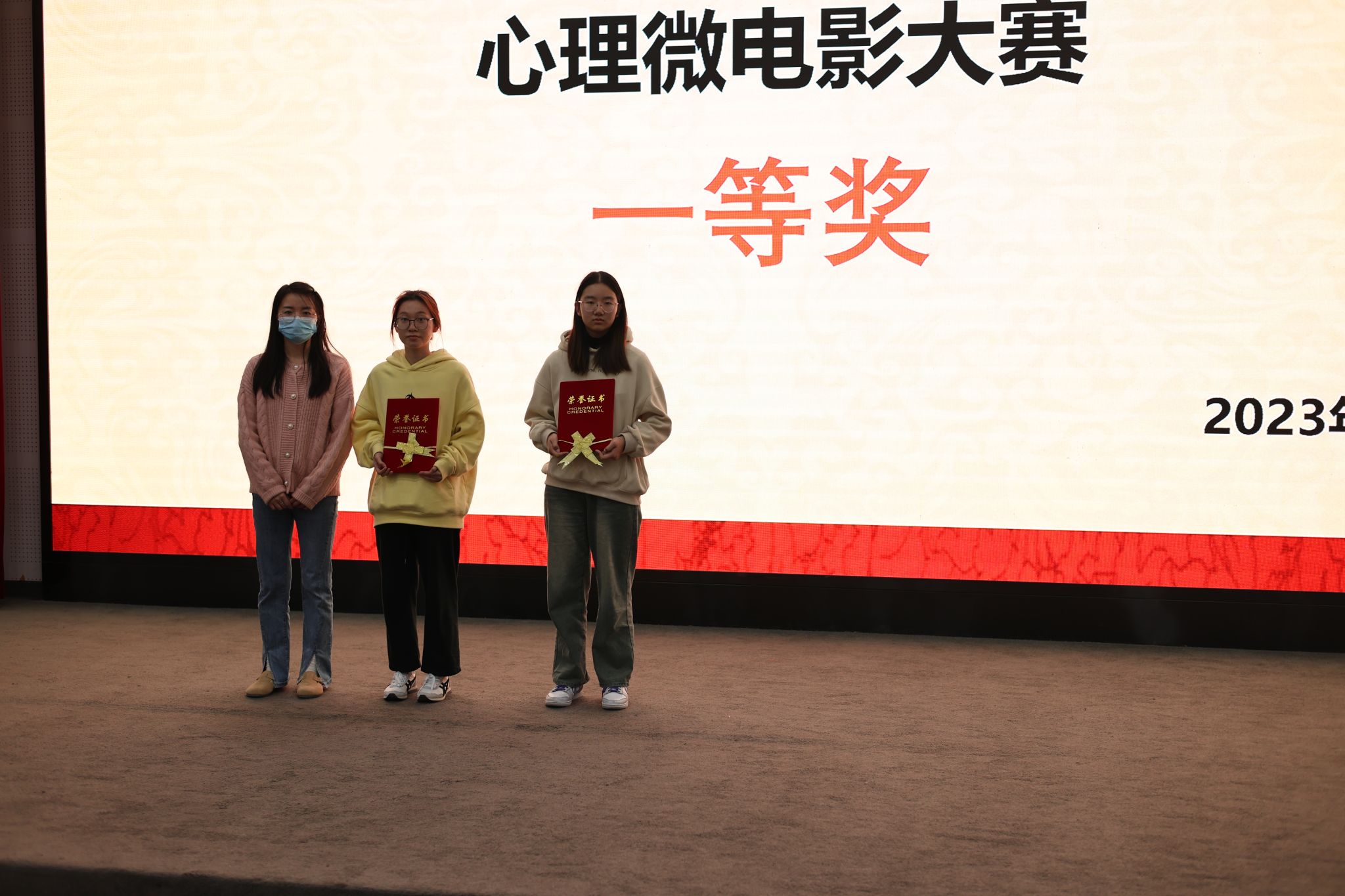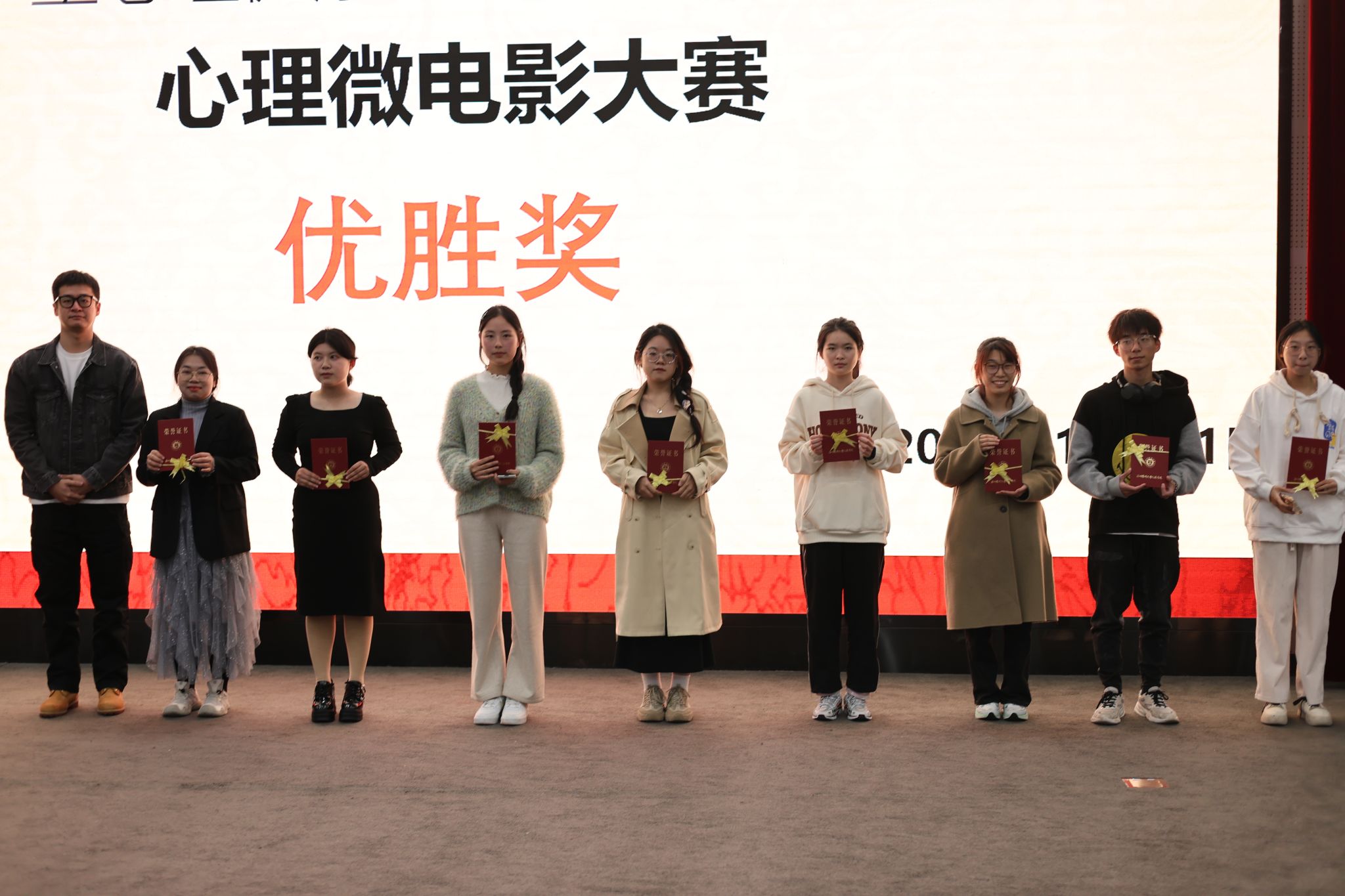 经过两个多小时紧张激烈的角逐,评委们从心理微电影的主题解说、技术效果、演员演技、剧本内容等方面进行了现场打分,《被遗忘的人》讲述了当代老员工面临的自我内耗问题,主角表演的张力融合光影的变幻让现场观众感受到心理微电影的独特魅力,荣获一等奖。本次大赛最终评选出一等奖2名、二等奖4名、三等奖11名,田丹老师、沈小冬老师及李宇老师分别上台为获奖队伍颁奖并合影留念。