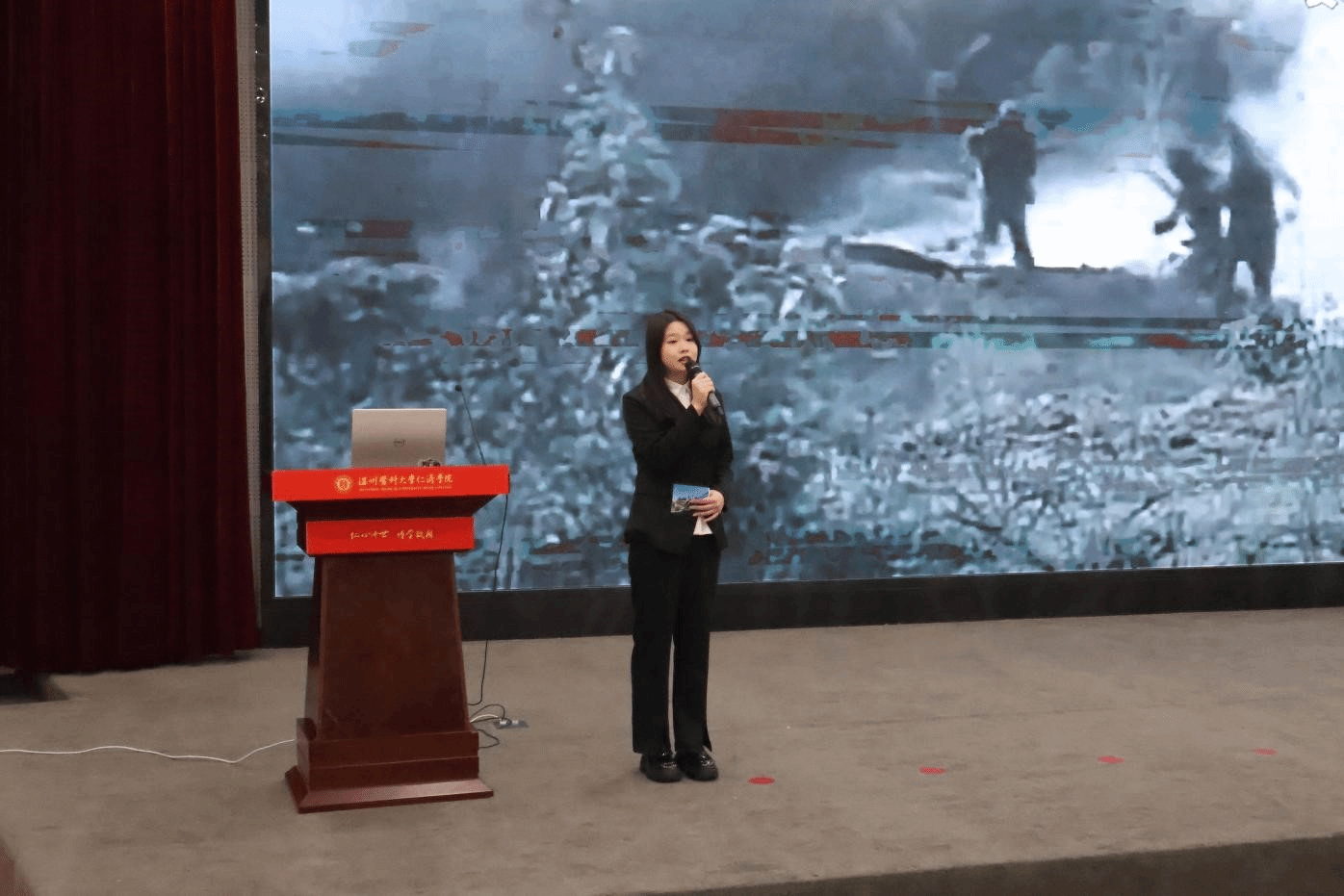 “海霞精神不仅是红船精神的延续,更是浙江精神的延续,它承载着习近平总书记的殷切嘱托。”王聪颖同学介绍了来自温州洞头海霞村的洞头先锋女子民兵连。她借一段视频生动地介绍了洞头先锋女子民兵连的历史以及现状,同时展望了海霞精神未来的传承之路,呼吁大家讲好红色故事,传承海霞精神。