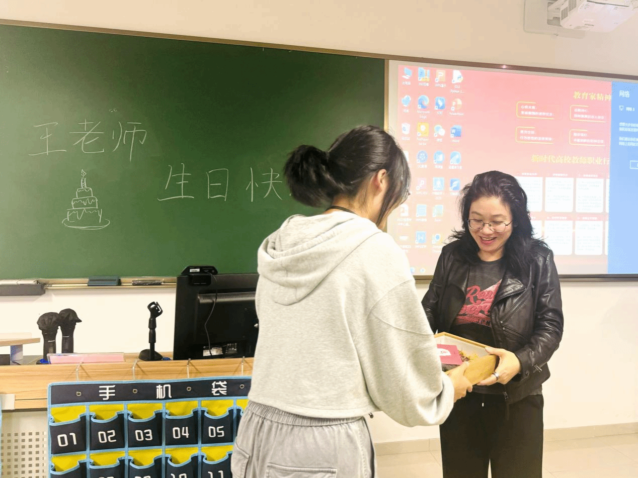 上课前,同学们提前到达教室,细心布置,在黑板上写着“王老师,生日快乐”,简洁而深情的祝福语凝聚了全班的敬意和祝福。当王老师步入教室,同学们齐声祝她“生日快乐”。随后,员工代表送上了精心准备的礼物:一本装满回忆的干花相册和两张手写贺卡,表达了对王老师的深情厚谊。王老师眼中闪烁着惊喜,脸上洋溢着幸福的笑容,温暖而灿烂。