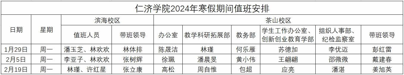 (三)寒期期间交通安排:每周一7:30从公司路校区至茶山校区,11:20返程;14:00从公司路校区至茶山校区,16:50返程。每周二至周日7:30从公司路校区至茶山校区,16:50返程。滨海校区寒假期间不安排通勤班车。医疗保障专车值班时间每天8:00-17:00,电话86699391。