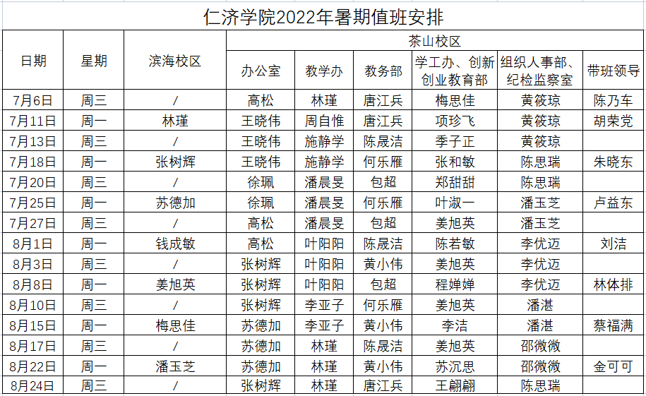 (一)暑假期间安排领导干部和工作人员每周一、周三分别在茶山校区和滨海校区值班(具体名单见下表)。茶山校区值班室设在7A-108办公室,电话:86699388;滨海校区值班室设在3309办公室,电话:63355856。保卫处安排人员巡查,24小时报警电话:86363110(公司路校区)、86699110(茶山校区)、63366110(滨海校区)。紧急情况需及时向分管领导及茶山校区值班处长报告。