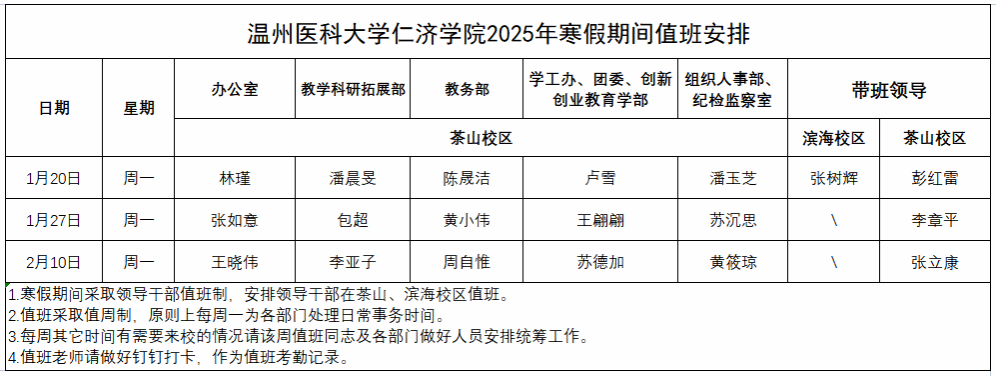 (三)寒假期间交通安排:每周一7:30从公司路校区至茶山校区,11:20返程;14:00从公司路校区至茶山校区,16:50返程。每周二至周日7:30从公司路校区至茶山校区,16:50返程。滨海校区寒假期间不安排通勤班车。
