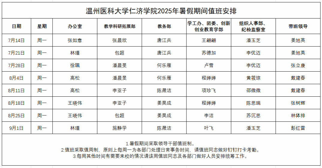 (二)放假期间,原则上每周一上午为各部门处理日常事务时间(值班安排详见下表)。