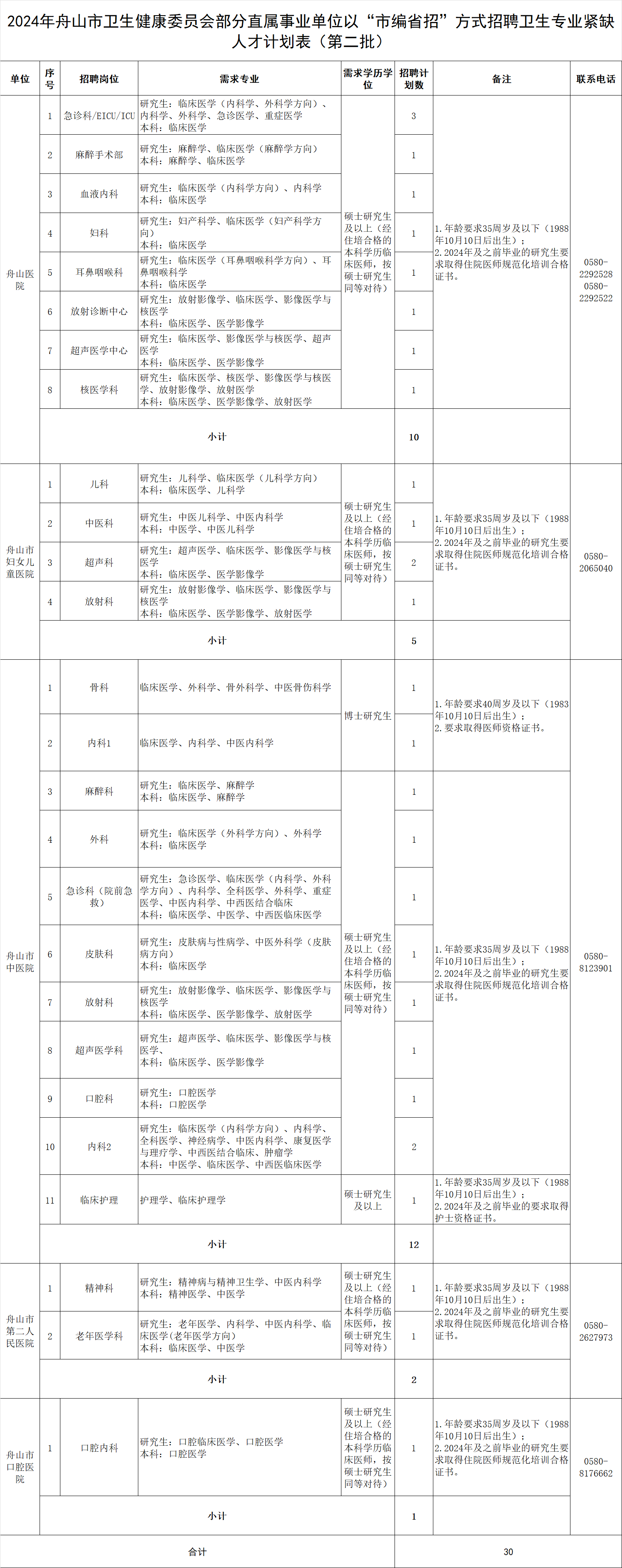 为加快夺取现代海洋城市建设更大成果,积极引进紧缺医疗卫生人才,根据《浙江省卫生健康委员会 舟山市人民政府印发关于支持舟山医疗卫生人才创新性培养使用的若干举措的通知》和《浙江省事业单位公开招聘人员暂行办法》要求,经舟山市人力资源和社会保障局同意,舟山市卫生健康委员会部分直属事业单位决定招聘(市编省招)卫生专业紧缺人才,现将有关事项公告如下: