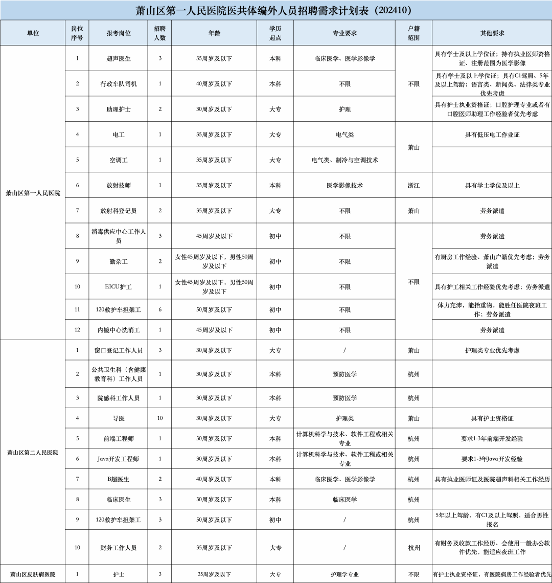 招聘详情及附件下载:关注!杭州市萧山区第一人民医院医共体编外人员招聘启事