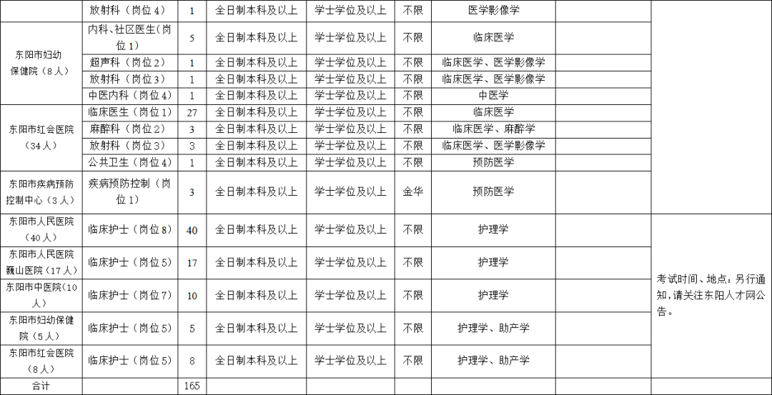 为推进“健康东阳”建设,加大人才招聘力度,根据我市医疗卫生实际,现面向2023年应届毕业生招聘165名卫技人员。现将有关事项公告如下: