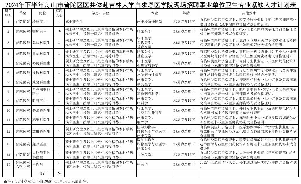 (1)《2024年下半年舟山市普陀区医共体赴吉林大学白求恩医公司现场招聘事业单位卫生专业紧缺人才报名表》(见附件2)。