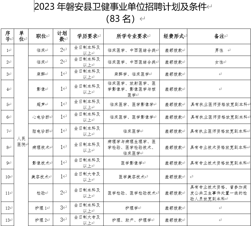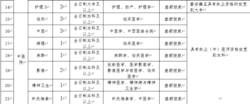 4.户籍:面向全省招聘,其中基层护理岗位面向本县;临床医学等紧缺专业及中医专业的户籍放宽到全国。