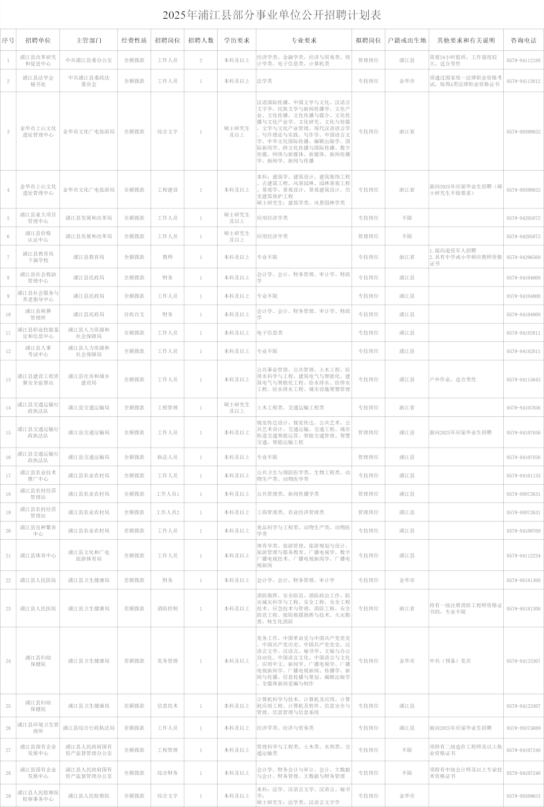 2025年浦江县部分事业单位公开招聘计划详见《2025年浦江县部分事业单位公开招聘计划表》(见附件1或下图),包括招聘单位、招聘岗位、招聘人数、学历要求、专业要求、户籍或出生地及其他要求和有关说明等。