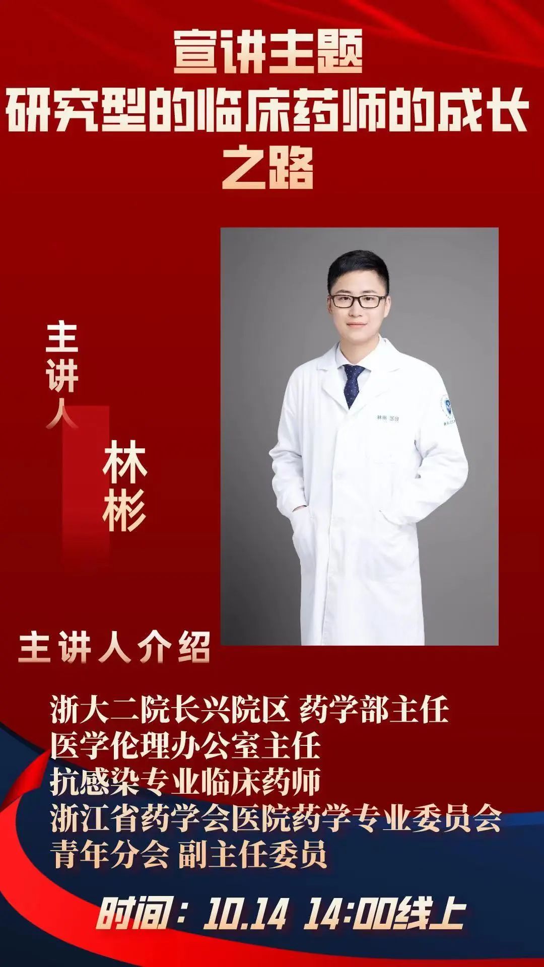 浙江大学医公司附属第二医经理兴院区药学部的林彬学长首先简单介绍了自己的学习成长经历,讲述了自己本科阶段参与的相关项目的研究、出国参与国际会议的部分经历,以及这些宝贵经历对自身的影响,并鼓励学弟学妹们也应勇于尝试。随后,林学长举例介绍了药物研究的药动学差异,并分享了自己在临床研究中发现的问题感悟。最后林彬学长表达了对受到本科母校邀请自己参加这次分享活动的荣幸,并对药学研究感兴趣的学弟学妹们表示欢迎。