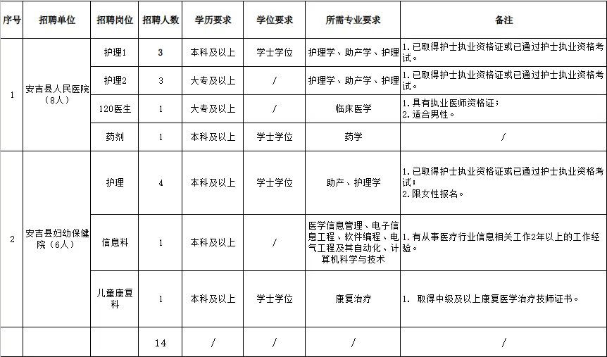 根据《安吉县卫计系统下属事业单位编外用工管理办法》(安卫计〔2016〕65号)文件精神,经研究决定,开展2024年安吉县卫生健康系统下属事业单位编外工作人员招聘工作,涉及2家下属事业单位,招聘岗位7个,招聘人数14名。现将有关招聘事项公告如下: