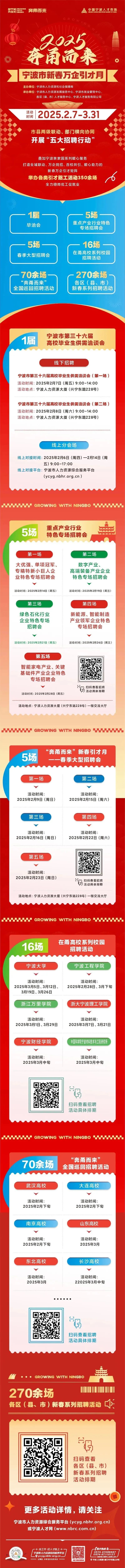 为抢抓农历春节后引才招工特殊“窗口期”,精准促进高校毕业生等重点群体就业,有效保障企事业单位引才用工需求,市门将于农历春节后正式启动“奔甬而来”2025年宁波市新春万企引才月活动,计划开展“五大招聘行动”,叠加宁波亲家园系列暖心服务,打造全域联动、万企同招、百校共引、暖心助力的新春万企引才矩阵,预计举办各类引才招工活动350余场,整个活动一直持续到3月底。