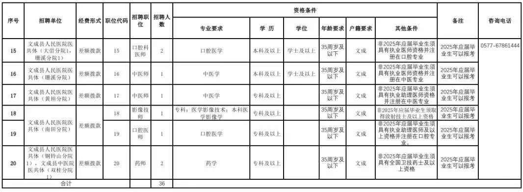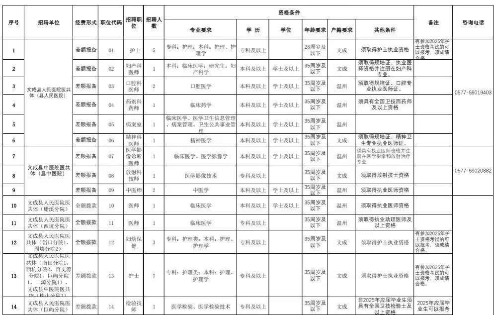 根据中共中央组织部、人力资源和社会保障部《关于进一步做好事业单位公开招聘工作的通知》(人社部发〔2024〕57号)和《文成县事业单位公开招聘工作人员暂行办法》(文政办发〔2008〕12号)文件精神,经研究决定,2025年文成县医疗卫生健康单位面向社会公开招聘36名卫技人员。现将有关事项公告如下: