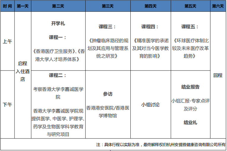 3.项目内容:邀请香港大学顶级专家和教授为员工授课,从对香港的医疗体制开始,围绕医学前沿等相关主题的讲座,增加员工对专业知识和医学领域国际前沿研究成果的认识;同时可以结识来自不同地区不同文化背景的同伴,建立人脉网络。参加的学员可以获得由香港大学颁发结业证书,根据学员的出勤率、结业汇报等完成情况,优胜小组学员获得推荐信。具体课程安排如下: