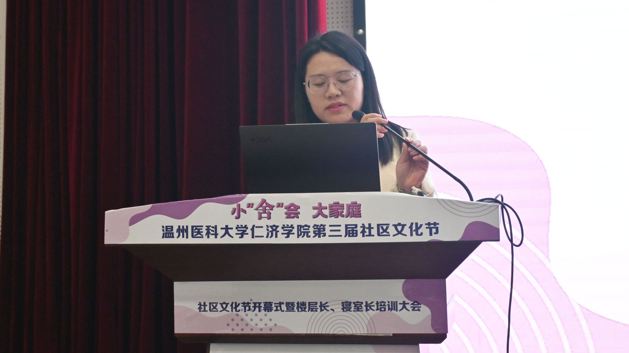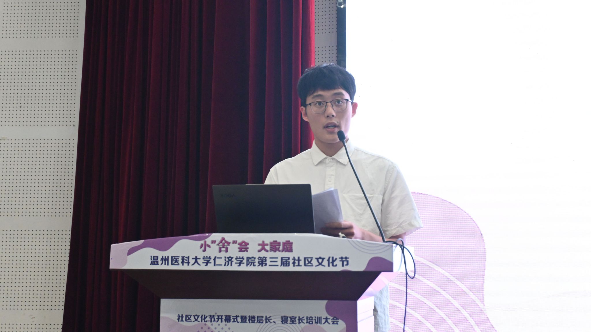 开幕式上,员工工作办公室主任季子正为楼层长代表颁发聘书并佩戴工作牌,副主任应亮选读了寝室长工作职责,员工自管会指导老师杨春燕老师介绍了社区文化节方案,优秀楼层长代表、全科医学专业员工屠栋凯分享了楼层长的工作点滴和实践经验,表态将继续认真履职尽责,关心同学,积极投身文明寝室建设。