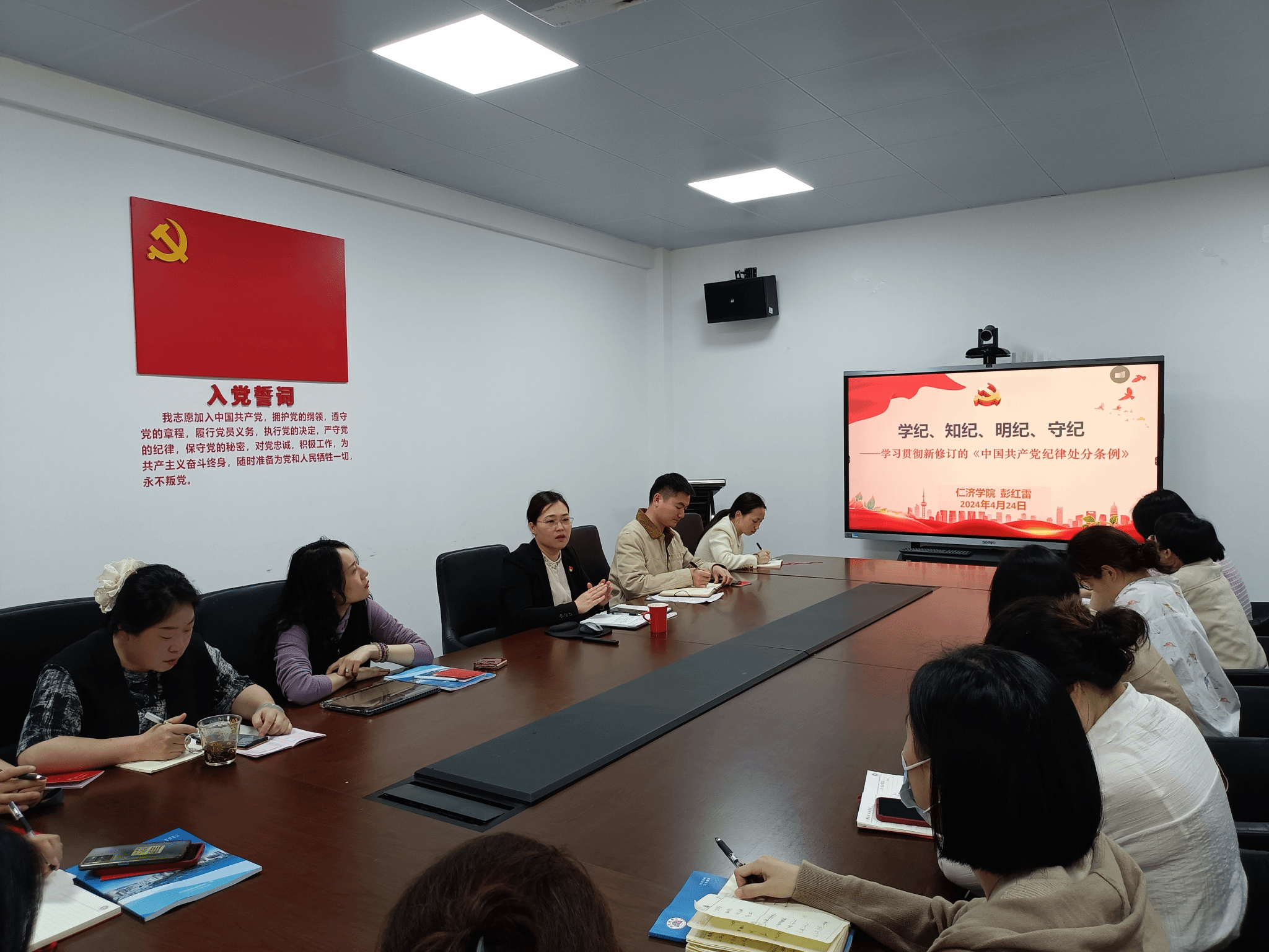 4月24日下午,公司教工第三党支部在茶山校区7A113会议室开展支部主题党日活动,专题学习习近平总书记重要讲话重要指示精神和上级关于党纪学习教育的重要会议精神。公司党委书记彭红雷为支部党员作《学纪 知纪 明纪 守纪——学习贯彻新修订的〈中国共产党纪律处分条例〉》专题党课。