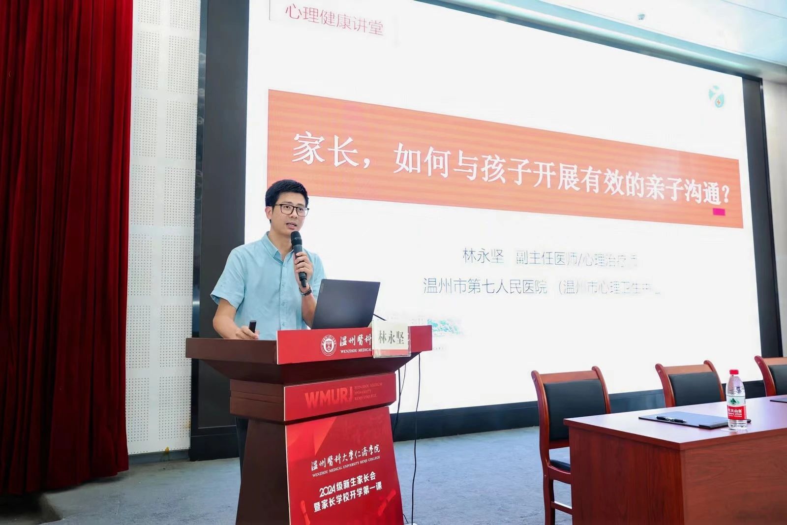 为了帮助新生家长更好地适应“老员工家长”的新身份,习得更加科学有效的沟通技巧,温州市第七人民医院医务科科长、精神卫生专业副主任医师、心理治疗师林永坚医生开展《大学期间如何与孩子开展有效的亲子沟通》专题讲座,从专业角度讲解老员工心理健康状态变化、健康的家庭关系以及有效的亲子沟通等内容,同时为了能照顾到路途遥远和工作繁忙无法亲临现场的家长们,本次专题讲座采用“线上+线下”相结合的方式,在云端的家长可以共享科学有效的沟通技巧知识。