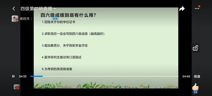 来自23级全科医学专业的“小老师”张天轶,曾在英语六级考试中获得533分的优异成绩,并获公司二等奖学金,她为同学们带来了两期英语四级考试辅导课程。在讲解中,她首先对听力、阅读、作文、翻译等四个板块的题型逐一进行了深入剖析,分享了自己独特的破题方法。比如,关于阅读理解,做题顺序可以依照仔细阅读、长篇阅读、词汇理解的顺序进行突破,给同学们分享了高效的做题“小妙招”;做翻译题的时间可以缩短,将节省的时间留给阅读理解,帮助大家精准提分。她温馨提醒同学们考试时要认真阅读注意事项,在做题过程中要注意圈画关键词,要注重平时的词汇积累等,助力同学们以良好平稳的心态应对考试。