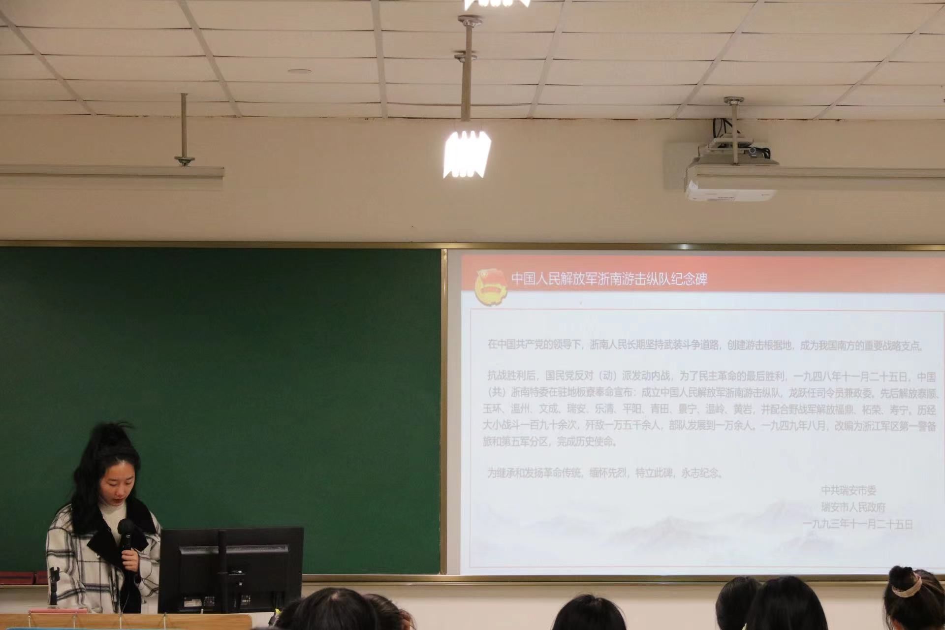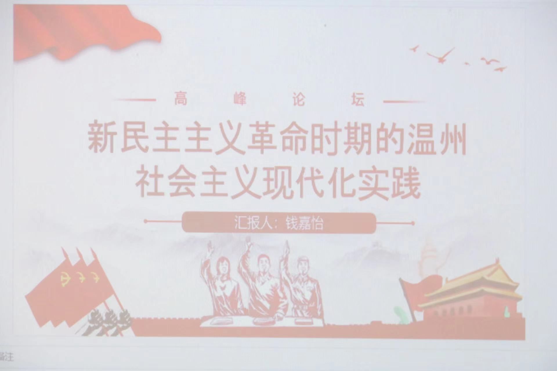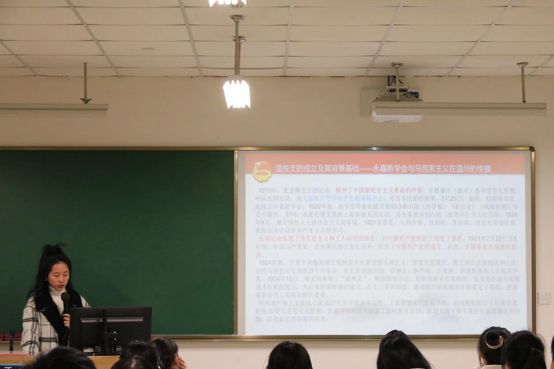 2023年11月24日,K1体育公司党建服务与人才培训中心在滨海校区进行了一周看时事活动。钱嘉怡同学围绕“新民主主义革命时期的温州社会主义现代化实践”这一主题来展开。新民主主义革命时期我们党团结带领人民浴血奋战、百折不挠,经历北伐战争、土地革命、抗日战争、解放战争,推翻了三座大山,建立中华人民共和国,实现了民族独立、人民解放,为实现现代化创造了根本社会条件。