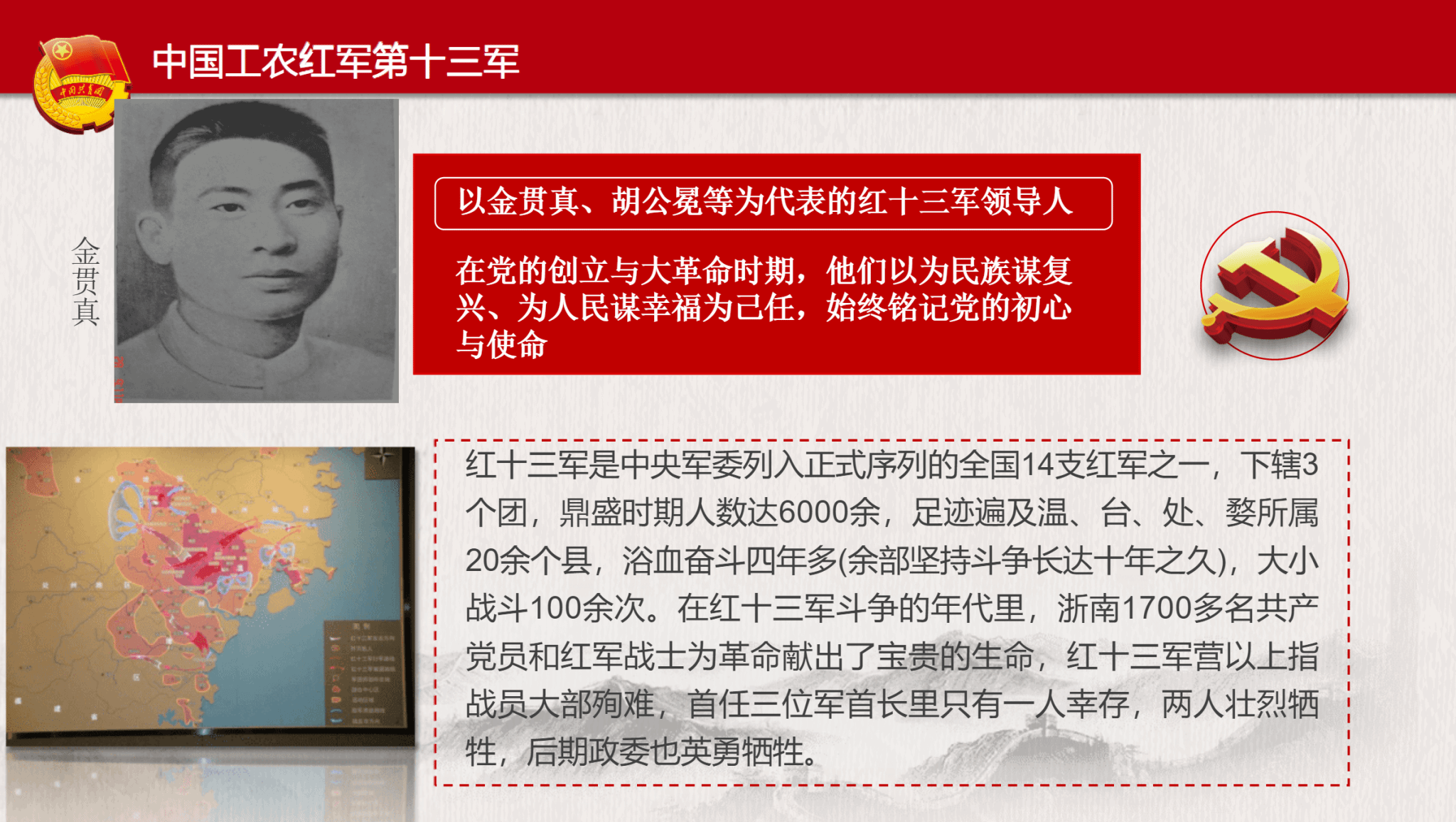 浙南地区开展工农革命工作,建立的红十三军,充分展现了“怀抱理想、敢为人先的求真精神”,“艰苦卓绝、不怕牺牲的斗争精神”,“为民奉献、自强不息的进取精神”。作为中央军委列入正式序列的全国14支红军之一的红十三军,是中央在全国集中红军力量、统一指挥红军的结果,更是土地革命时期浙江农民武装暴动最重要的成果,在中国共产党的历史和军史上有着重要的地位。