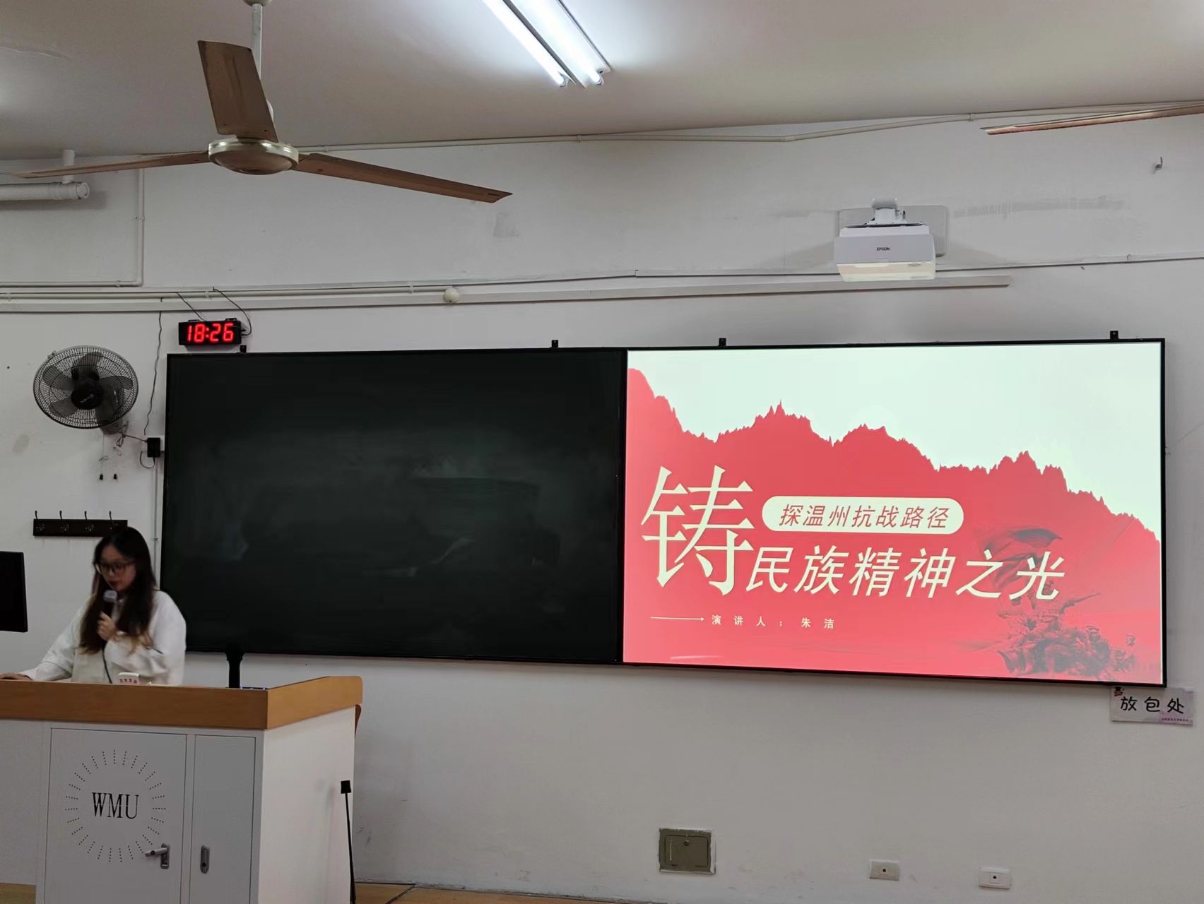 深入探索温州抗战路径,了解民族精神,党建服务与人才培训中心于2024年4月27日晚18:30于茶山校区7C107开展以“探温州抗战路径,铸民族精神之光”的高峰论坛活动。主讲人朱洁同志通过一段抗战视频引入抗日战争,让同志们更好的了解了战争的残酷以及中国人民对侵略的奋起反抗。