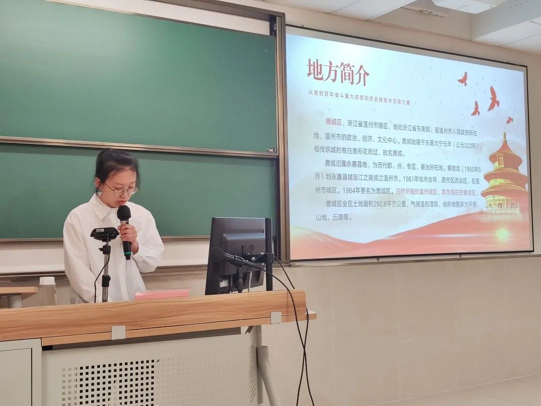 接下来林锦婕同志讲述了鹿城现代化过程,1921年7月23日中国共产党的正式成立。中国人民从精神上由被动转为主动。随着形势的发展,“温独支”逐步开展工农运动。当时温州规模较大的工厂为中一花席厂和鹿城布厂。1978年12月,党的十一届三中全会的召开,让温州人看到了希望的曙光。温州人章华妹更是敢为人先,积极响应国家号召,为推动民营资本快速发展贡献出自己的力量。