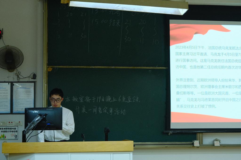 2023年4月19日晚六点三十分,党建服务与人才培训中心分别于茶山校区和滨海校区开展了以“马克龙访华”为主题的一周看时事活动。主讲人从“中法、中欧关系的战略规划”、“中法、中欧之间的经贸合作”、“乌克兰危机与全球性挑战”三个方面进行详细讲述。