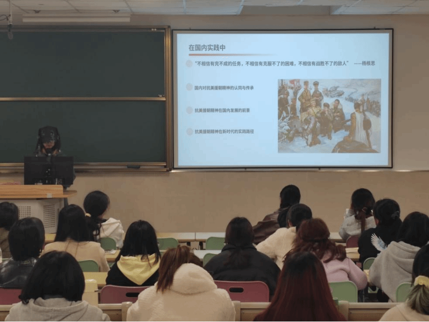 主讲人接着讲述了抗美援朝的精神内涵。抗美援朝精神包括了祖国和人民的利益高于一切、为了国家和民族的尊严而奋不顾身的爱国主义精神;不畏艰难、始终保持高昂士气的革命乐观精神;还有志愿军战士们和朝鲜人民同仇敌忾,并肩作战体现出来的国际主义精神。