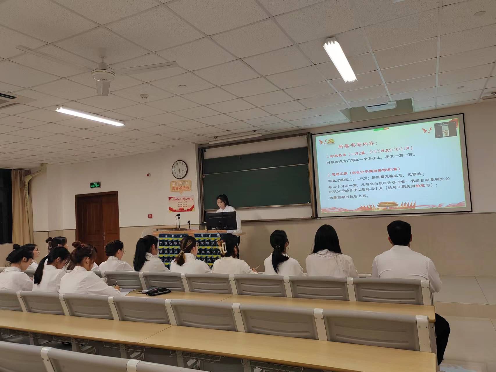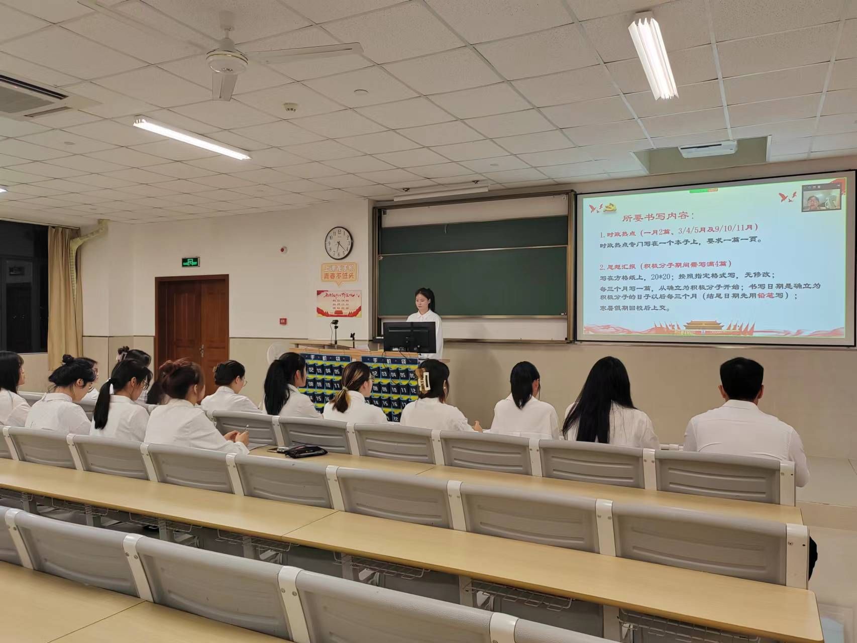 大会伊始,为保证大会有序进行,主持人重点强调了会议纪律。第一项议程全体起立、奏唱国歌,随后会议正式开始。首先,主持人具体陈述了入党积极分子详细的发展细则,包括材料书写要求、答辩要求、党内活动安排等,并对积极分子未来的发展提出了明确要求。希望各位入党积极分子,以本次大会为新的起点,进一步强化思想淬炼,端正入党动机,锤炼对党绝对忠诚的政治品质,切实提高服务大局、服务群众、服务社会的综合素养。紧接着入党积极分子代表徐茜阳同志进行发言,她讲述了中国共产党的光荣历史,并代表全体积极分子展望未来,在思想上坚定信念,在学习上学好党史党章,在工作上兢兢业业,在生活上作风优良。随后,支部各小组代表分别介绍了所在小组的工作内容和特点,同时热烈欢迎新同志的加入,并期待他们能发挥自身才干,为支部发展贡献力量。最后,党总支书记汪玲玲老师和支部负责人卢沈婕同志对入党积极分子们表达祝贺并总结发言,希望各位同志继续以更高的标准要求自己,深入学习理论知识,端正入党动机,充分发挥先锋模范作用。