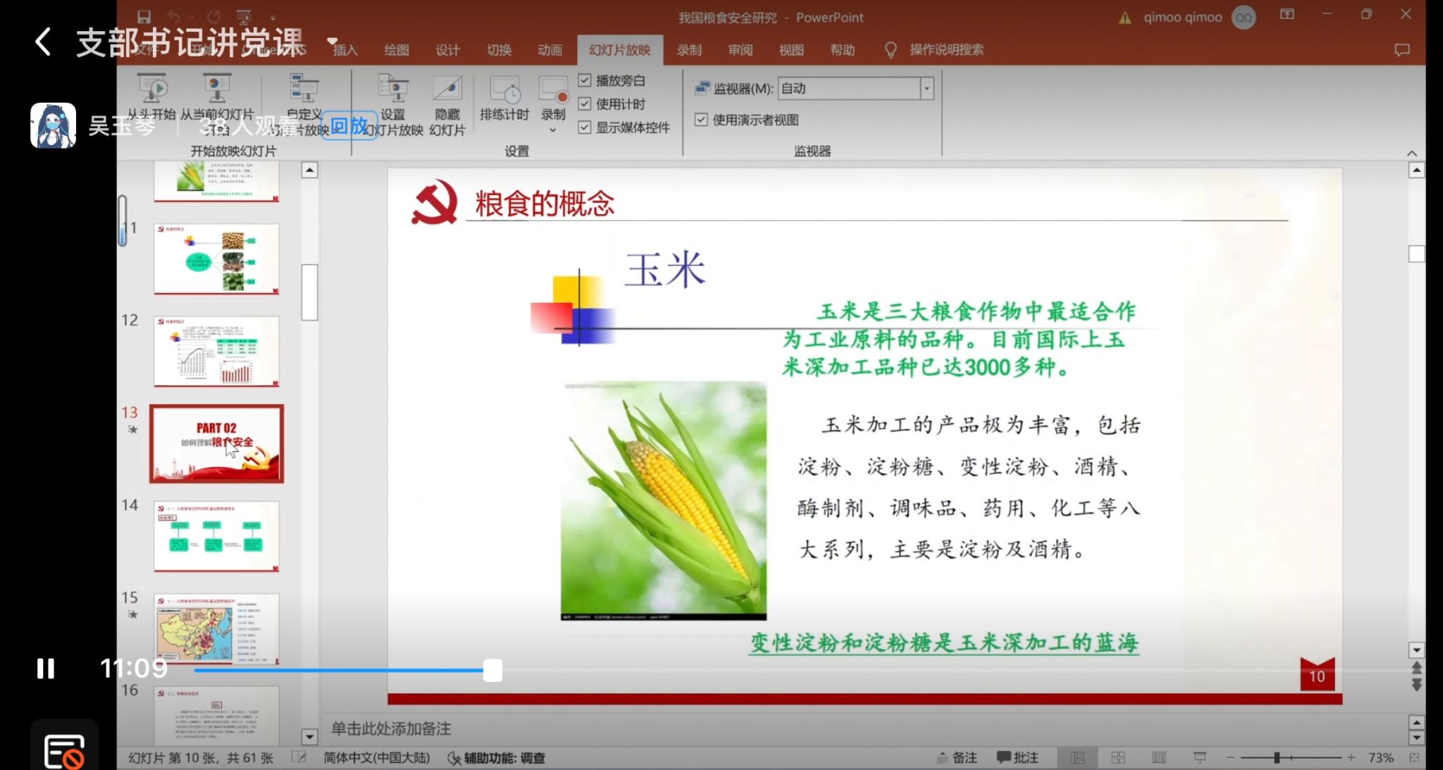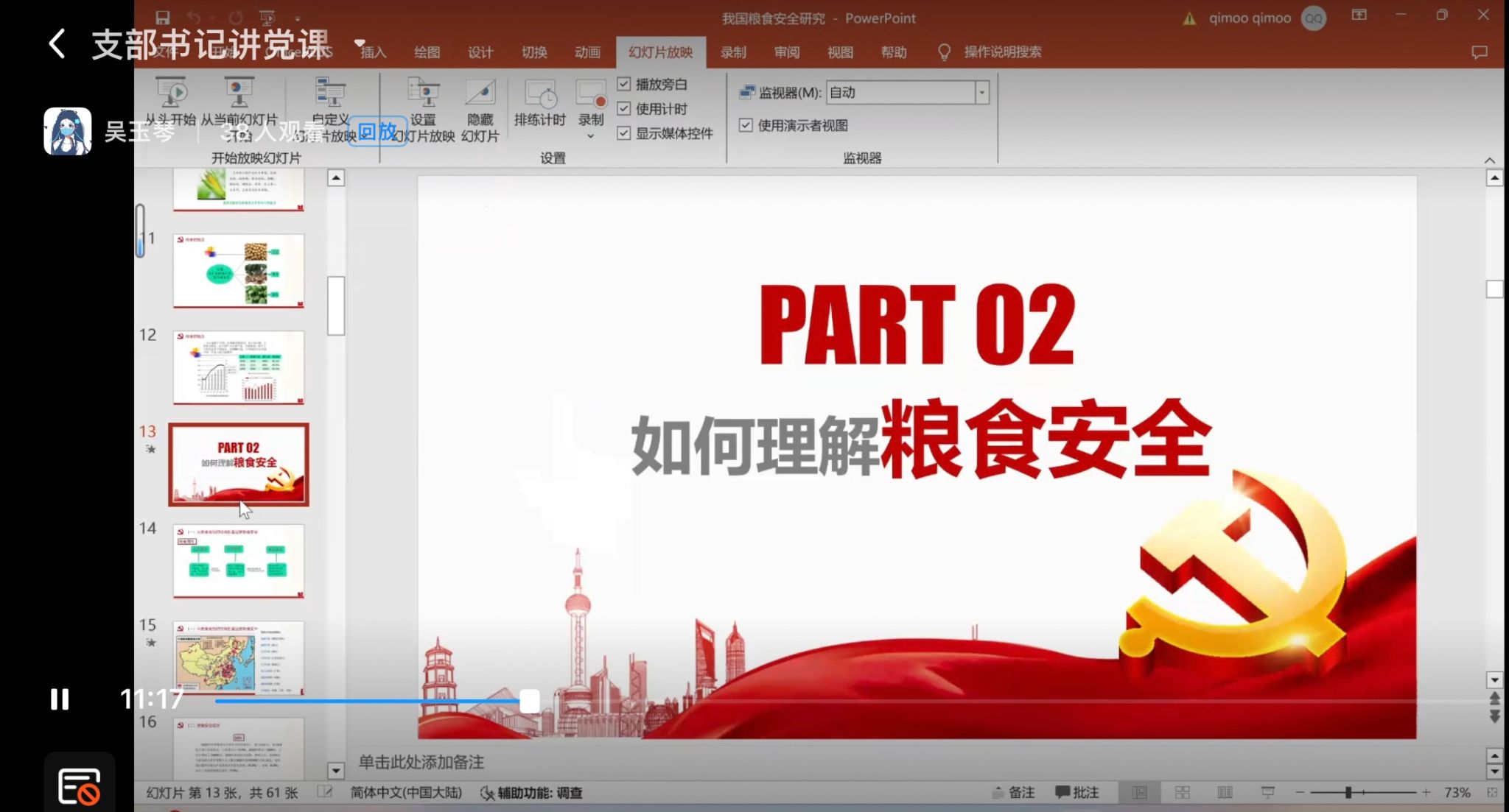民以食为天。为深入学习贯彻习近平总书记关于国家粮食安全的重要论述精神,在支部成员中加强粮食安全宣传教育,引导支部成员增强惜粮意识,护理系第一党支部于12月11日晚以钉钉直播的方式开展了云端党课,本次党课由支部书记吴玉琴老师主讲。
