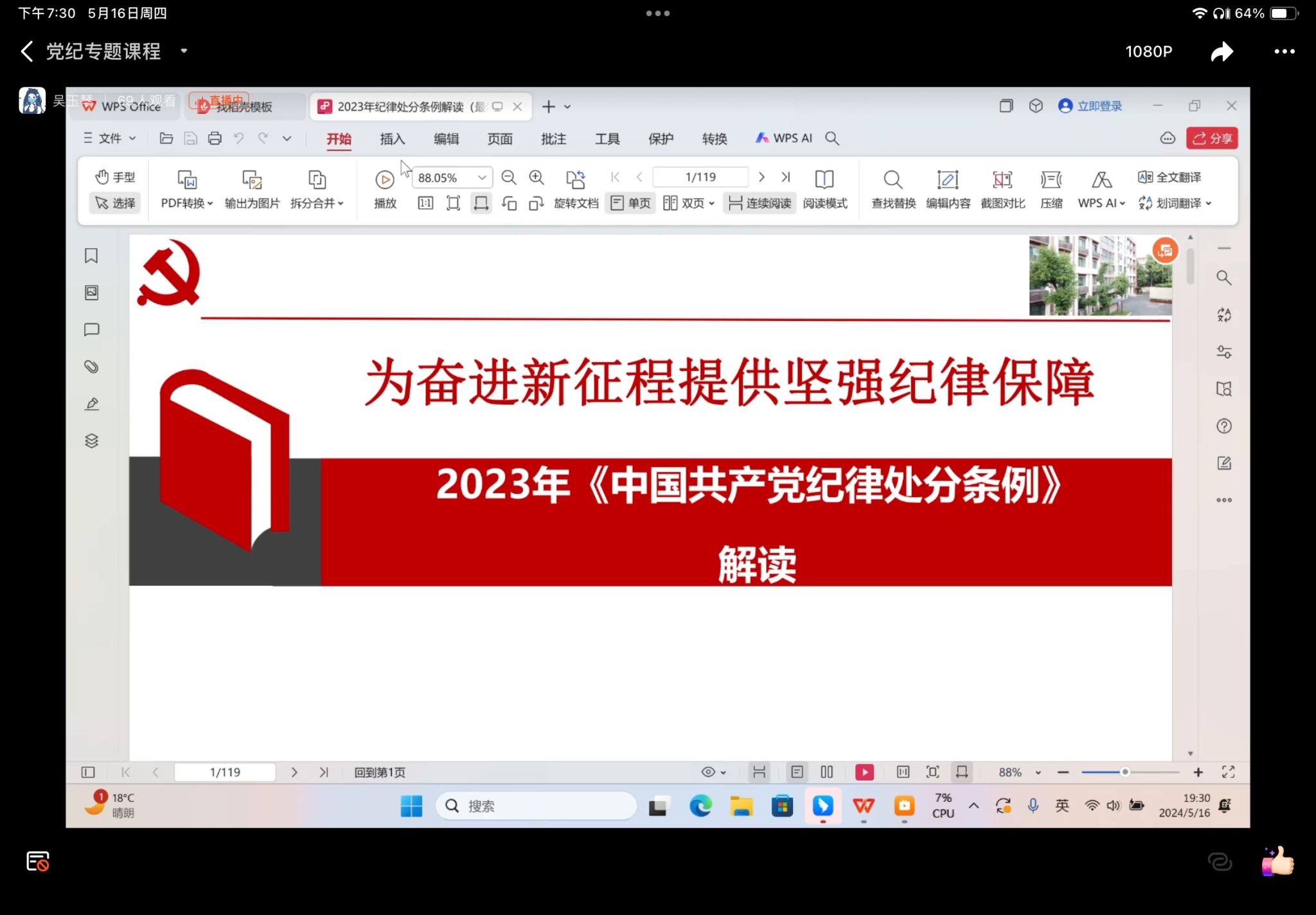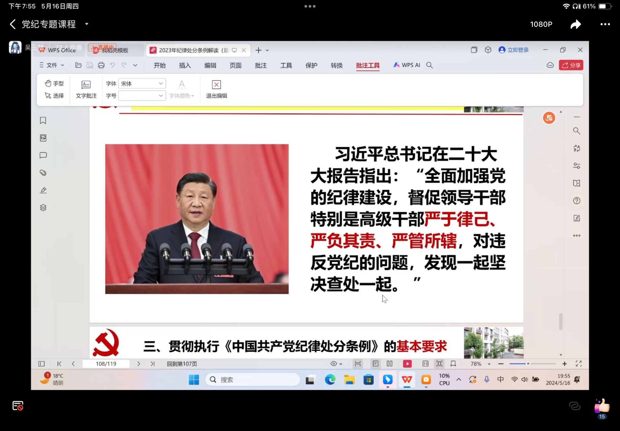 以纪为镜,警醒自我。为强化党组织成员遵守党纪的意识,护理系第一党支部于2024年5月16日晚以钉钉直播的形式开展了专题纪律党课,本次党课由护理系第一党支部书记吴玉琴老师主持。