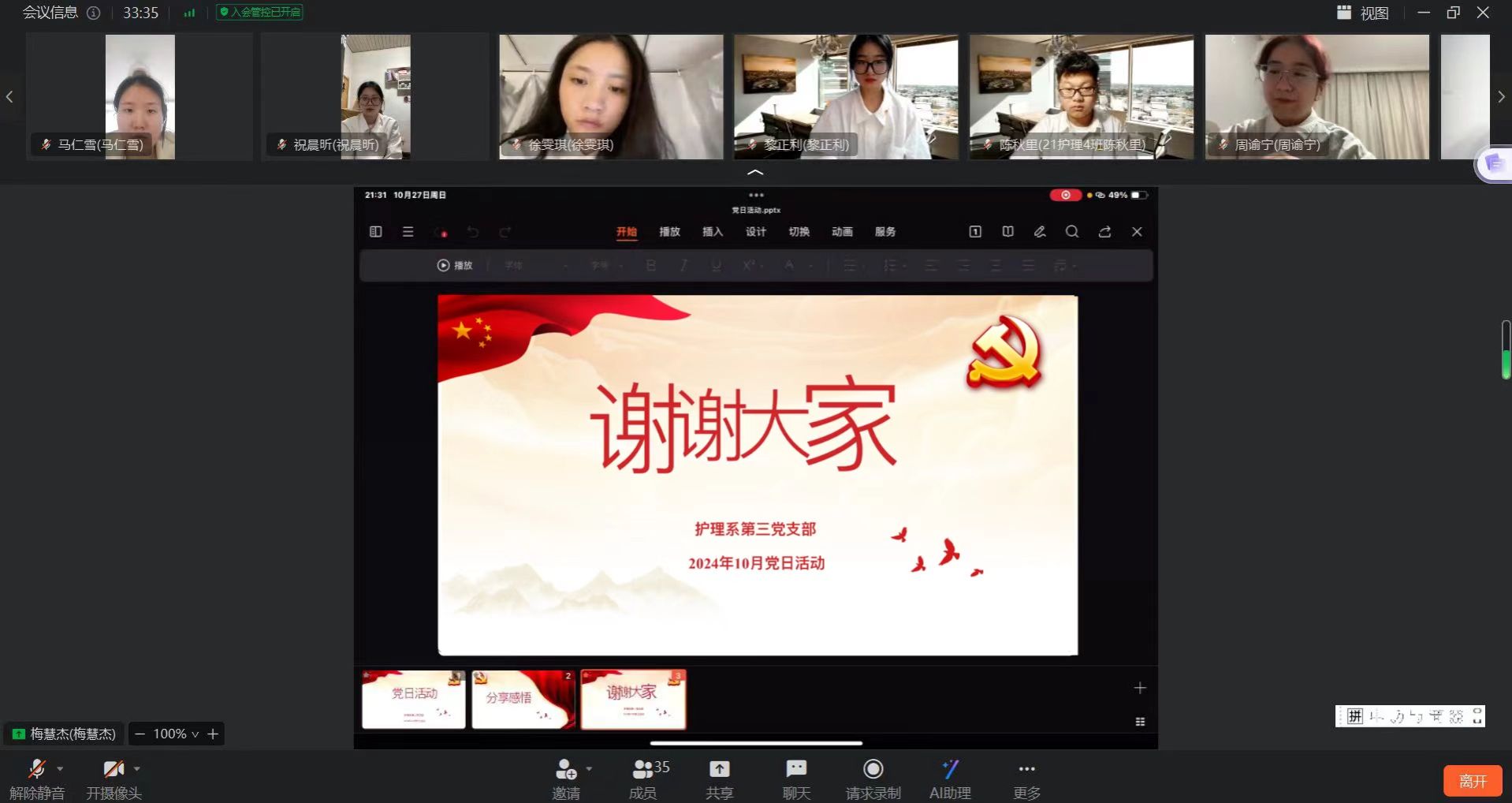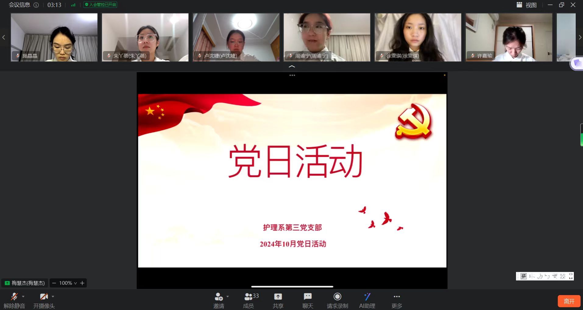 为促使支部党员学习《中国共产党不合格党员组织处置办法》中与党员相关的条款,对文件中规定的不合格情形做到心中有戒律,行为有尺度。2024年10月27日晚上21:00,护理系第三党支部开展十月主题党日活动。本次主题党日活动采用支部同志逐一发表学习感悟和心得体会的方式开展,由支部书记汪玲玲老师主持。
