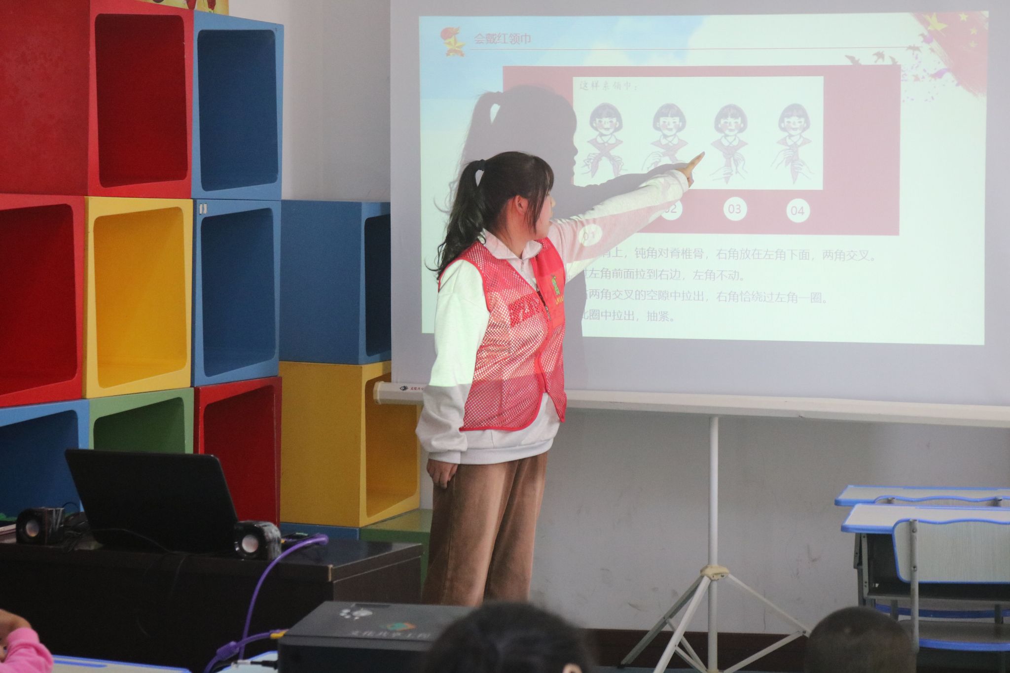 志愿者从何为少年先锋队开始,通过介绍少先队的性质和目的,让“小红领巾”们认识到了这是一支共产主义接班人的队伍。小朋友们学习少先队的知识过程中,爱祖国、爱人民、爱劳动、爱科学、爱社会主义的五爱精神在他们心中扎下了深根。课程中还展示了队徽、队旗,教授同学们如何正确佩戴红领巾和高唱队歌。