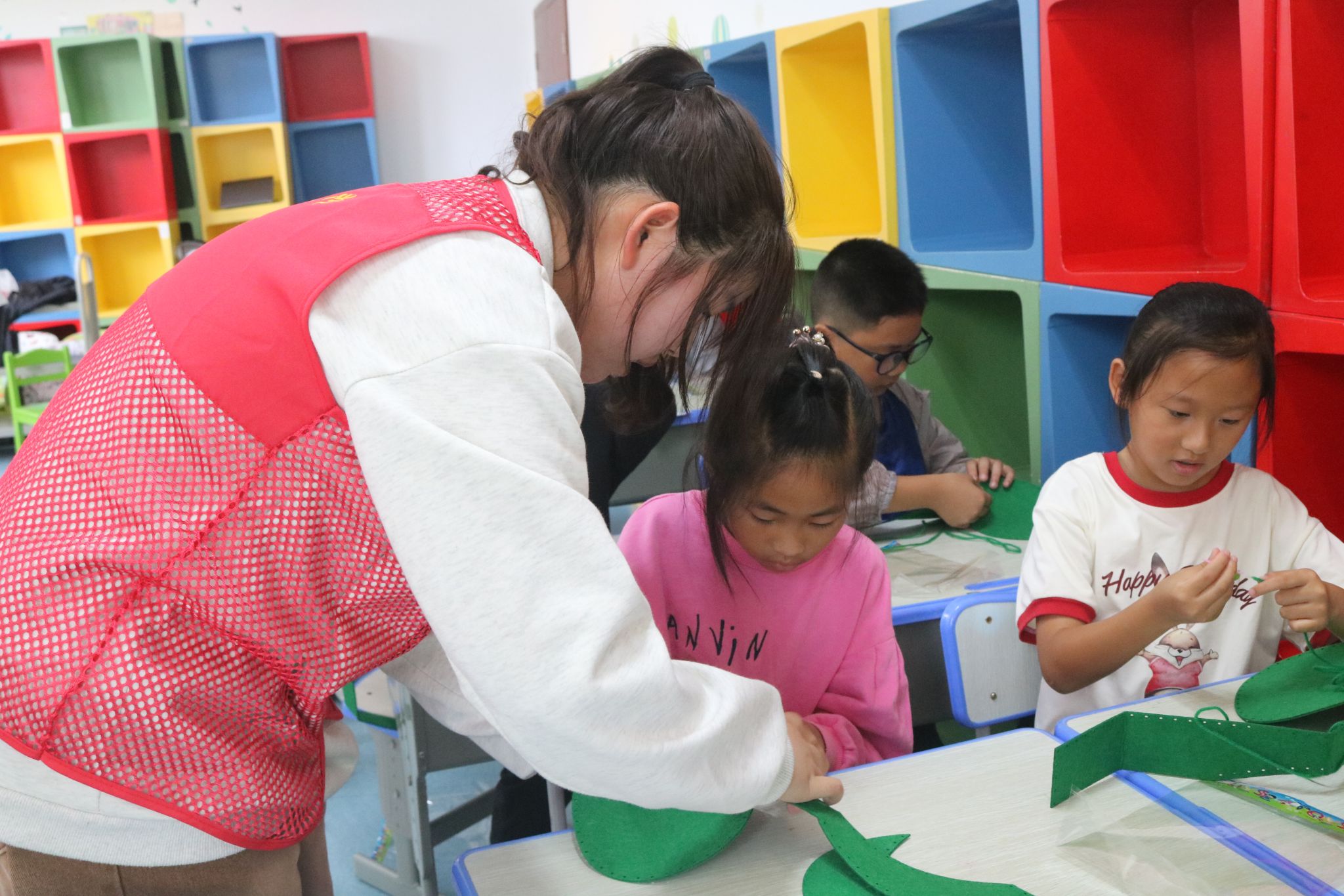 讲解完毕,进入充满乐趣的手工制作时间。在志愿者的指导下,小朋友通过自己的双手开始制作红军帽。一针一线都充满了他们对红军的敬意和对少年先锋队的憧憬。