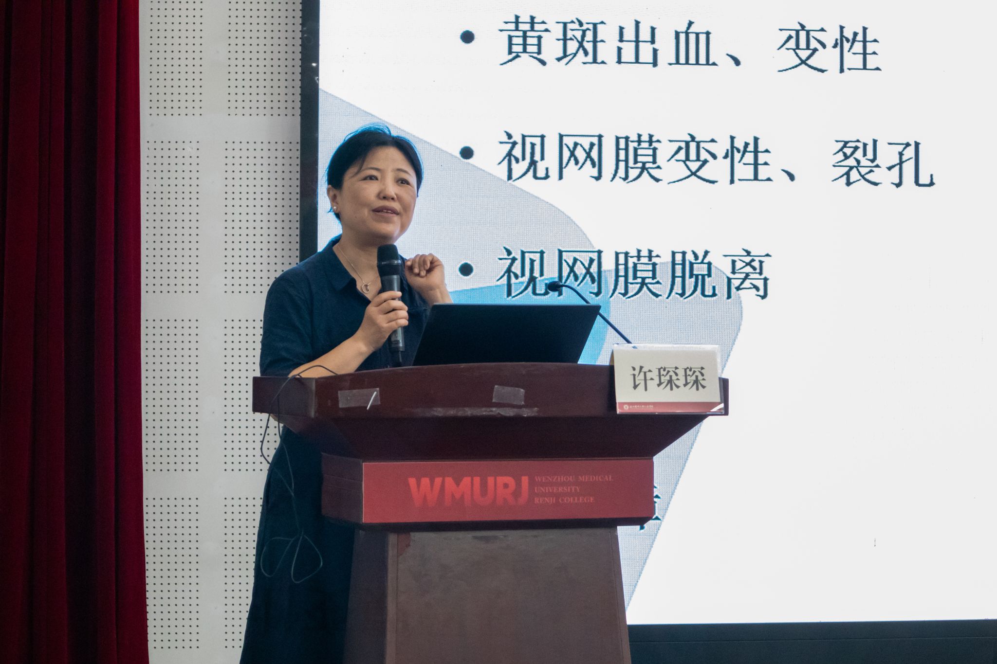 当天下午,眼健康科普讲座——《近视那些事儿》在滨海校区仁心厅开讲。许琛琛与苏炎峰两位主讲老师以其深厚的专业知识和生动有趣的语言,为员工们带来了一场关于眼健康的精彩讲座。他们详细介绍了近视、远视、散光、老花眼等常见眼病的识别和预防方法,让员工们在轻松愉快的氛围中掌握了这些知识。同时,老师们还深入讲解了白内障、青光眼、视网膜疾病等严重眼病的症状、治疗方法以及预防措施,让员工们对眼部健康有了更加全面而深刻的认识。