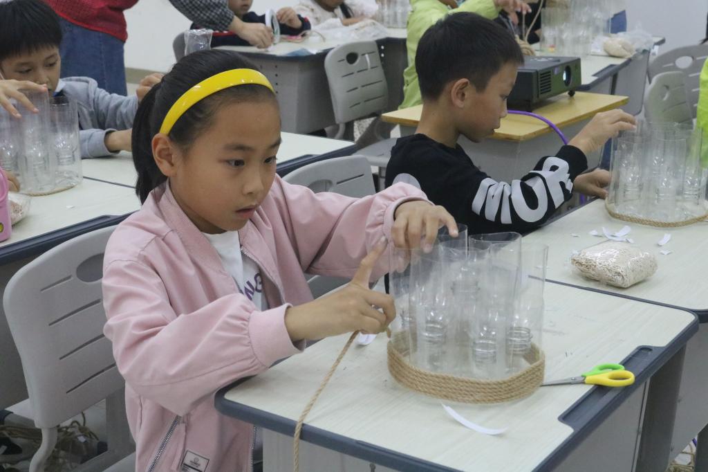 为更好的调动小朋友们保护环境的积极性,本次“乐驹学堂”的特色手工课程将带领小朋友们用矿泉水瓶制作笔筒。在志愿者耐心的指导下,小朋友们利用矿泉水瓶为基础材料,制作出了许多精美可爱的笔筒。每一个环保笔筒,既是绿色生活的表达,也是创新发明的生动体现,真正体现了“乐中学、动中学、玩中学”的教学模式。