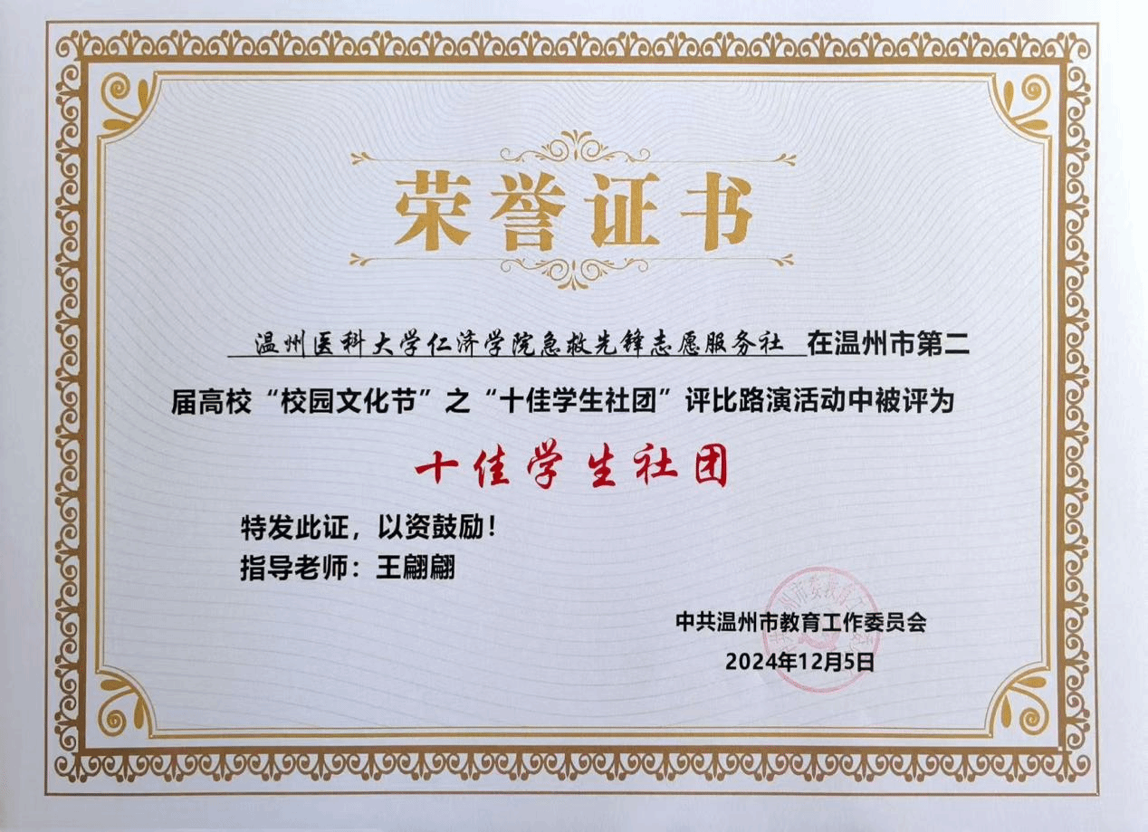 喜报:公司“急救先锋志愿服务社”社团荣获2024年温州市高校“十佳员工社团”荣誉称号发表时间:2025年01月17日 14:01 流览量:次 作者: 分享到: