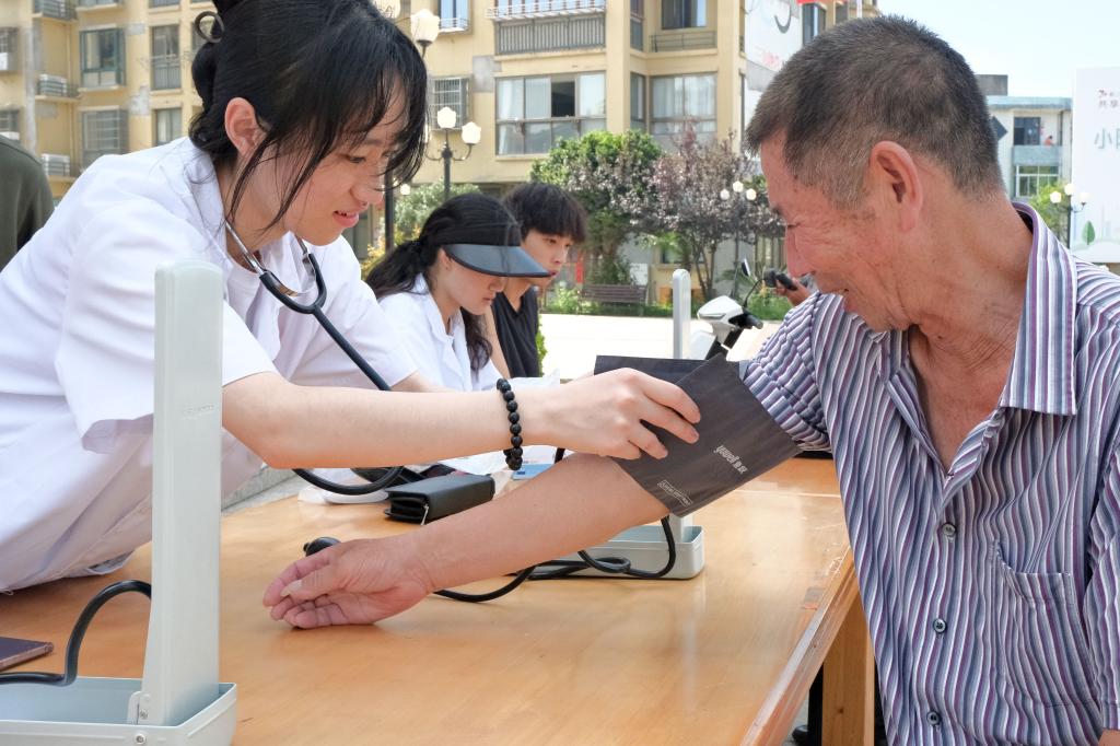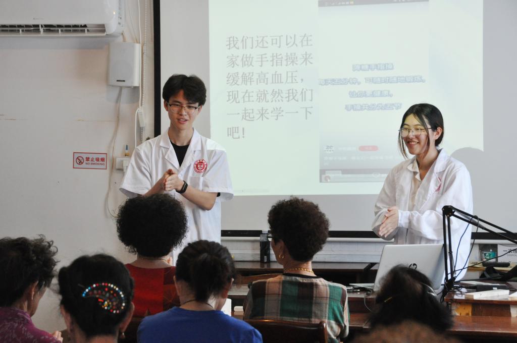 在实践队员的安排指导下,义诊场面和谐有序,老年人热情乐观,积极配合,脸上洋溢着笑容。实践队员们以问答形式对高血压疾病的成因进行科普,并总结相关预防方法。以学习手指操为切入点,为老年人群体带去身体助益。随后,大家就手指操步骤进行提问,现场笑声连连,奶奶们在座位上兴奋比划着,“这个操作简单,平时在家看看电视也能做!”