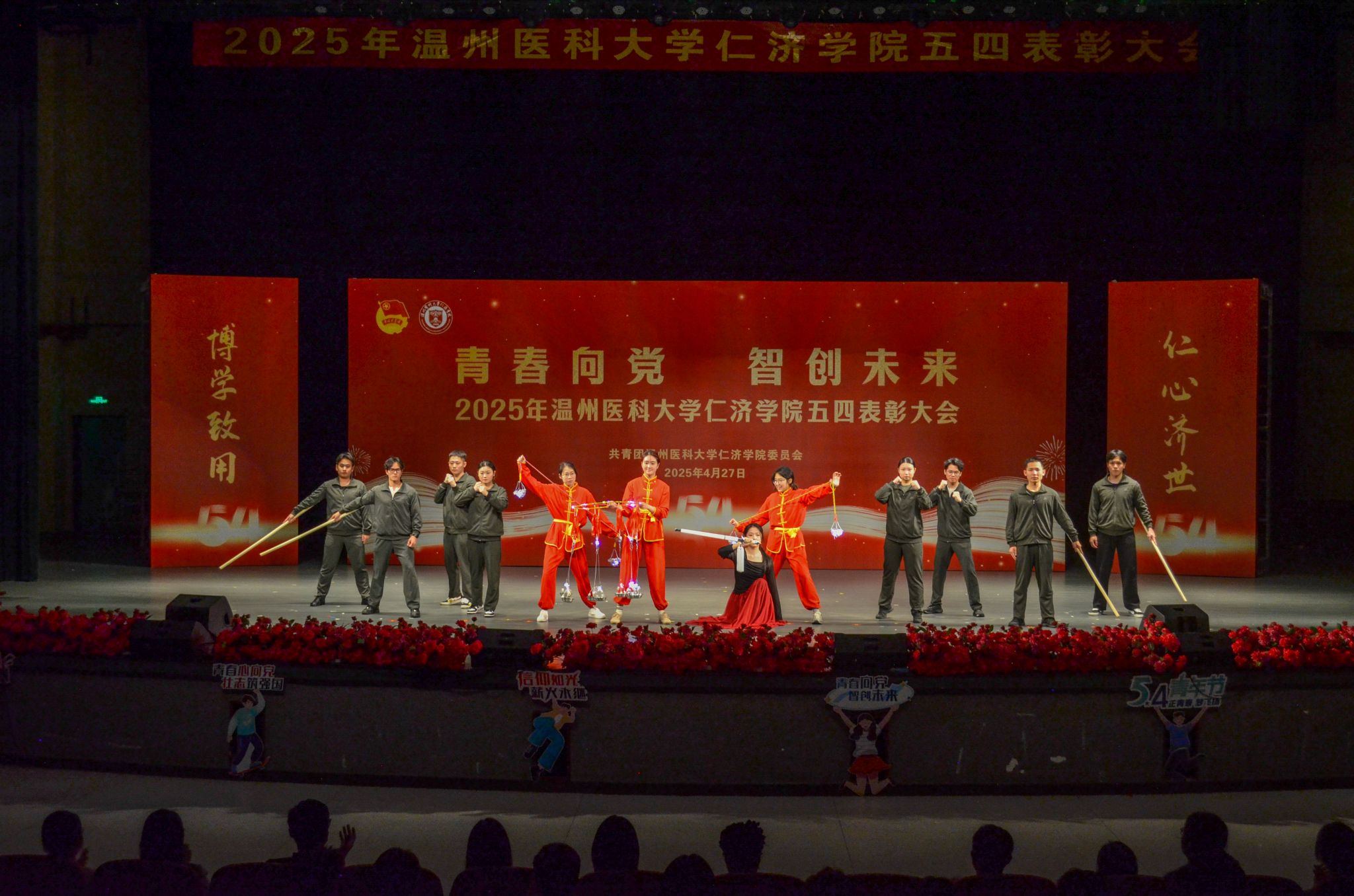 艺术思政展演以三个精彩篇章生动呈现:合唱队以《玉盘》演绎中华千年古韵;广播剧《功勋》深情演绎时代楷模;器乐队以《象王行》奏响华夏风骨;小品《海霞女兵的故事》展现洞头先锋女子民兵连的巾帼风采;民舞《觉醒年代》以生动的舞姿诠释历史觉醒;《星芒淬刃》展示出中华技艺的薪火相传;街舞队带来的《天生就要飞》跃动青春活力;《青春中国》人机共演展现科技与人文的碰撞。