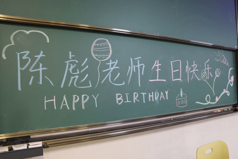 当晚课程开始前,院员工团委的工作人员提前来到教室,精心布置出温馨的庆生氛围。黑板上“陈彪老师生日快乐” 八个字格外醒目,旁边点缀着手绘的小气球与小礼炮图案,色彩明快、充满童趣,每一笔都饱含着对老师的敬意与祝福,让原本严肃的教室瞬间充满了欢乐与暖意。