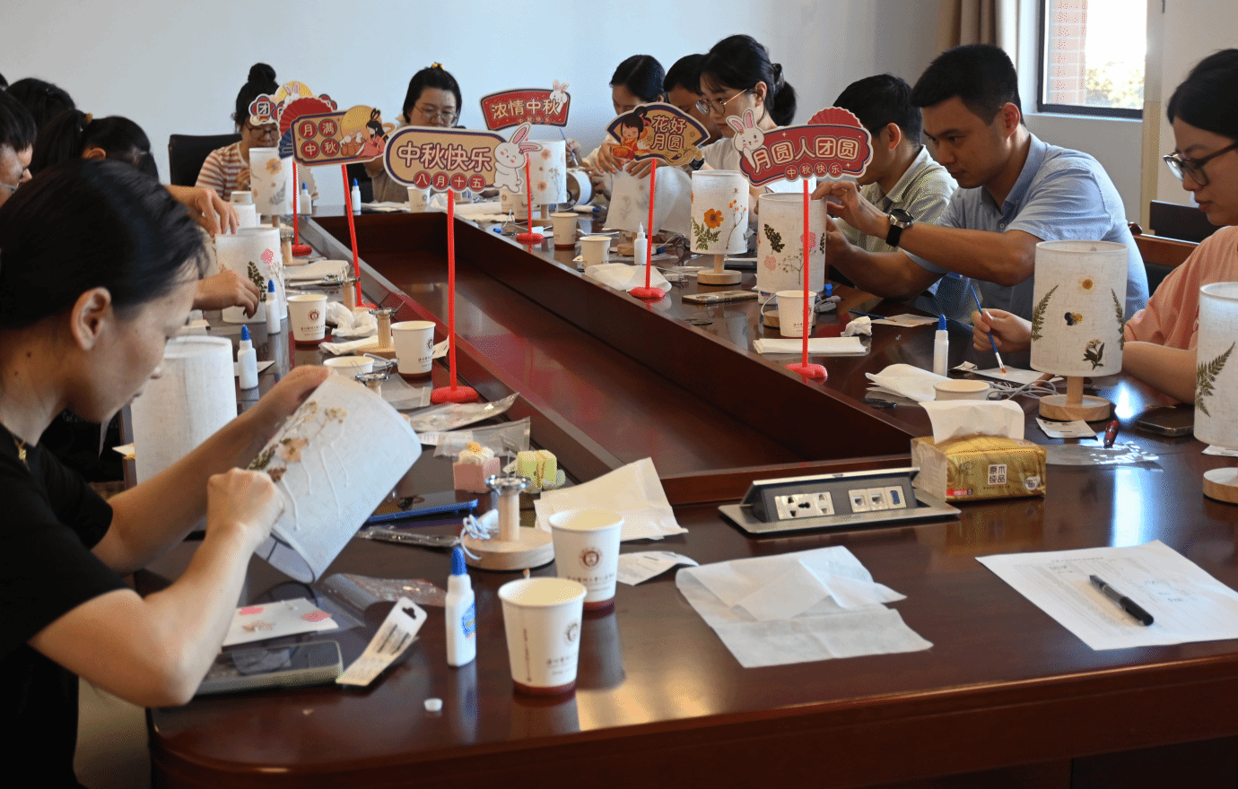 花灯DIY活动环节,大家围坐一堂,手持提前准备好的灯笼材料包,在互相学习中折叠、拼接、粘贴,将花草树木等材料逐步变成一盏盏样式别致、透着温馨光芒的中秋主题花灯。一盏盏被点亮的花灯,寄托着大家对美好生活的祝愿。