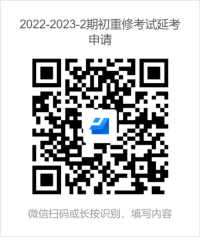 2.重修课程缓考申请需在2023年2月13日前扫描“2022-2023-2期初重修考试延考申请”二维码进行登记。填写前务必仔细阅读页面内的注意事项及各条目的填写说明。若需申请将多门重修考试进行延期,需逐次扫描二维码填写,并分别提交。