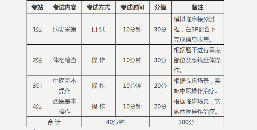 (1)考试形式:客观结构化临床考核(Objective Structured Clinical Examination,以下简称“OSCE”),包括问诊、操作、标准化病人(Standardized Patients,以下简称“SP”)配合。