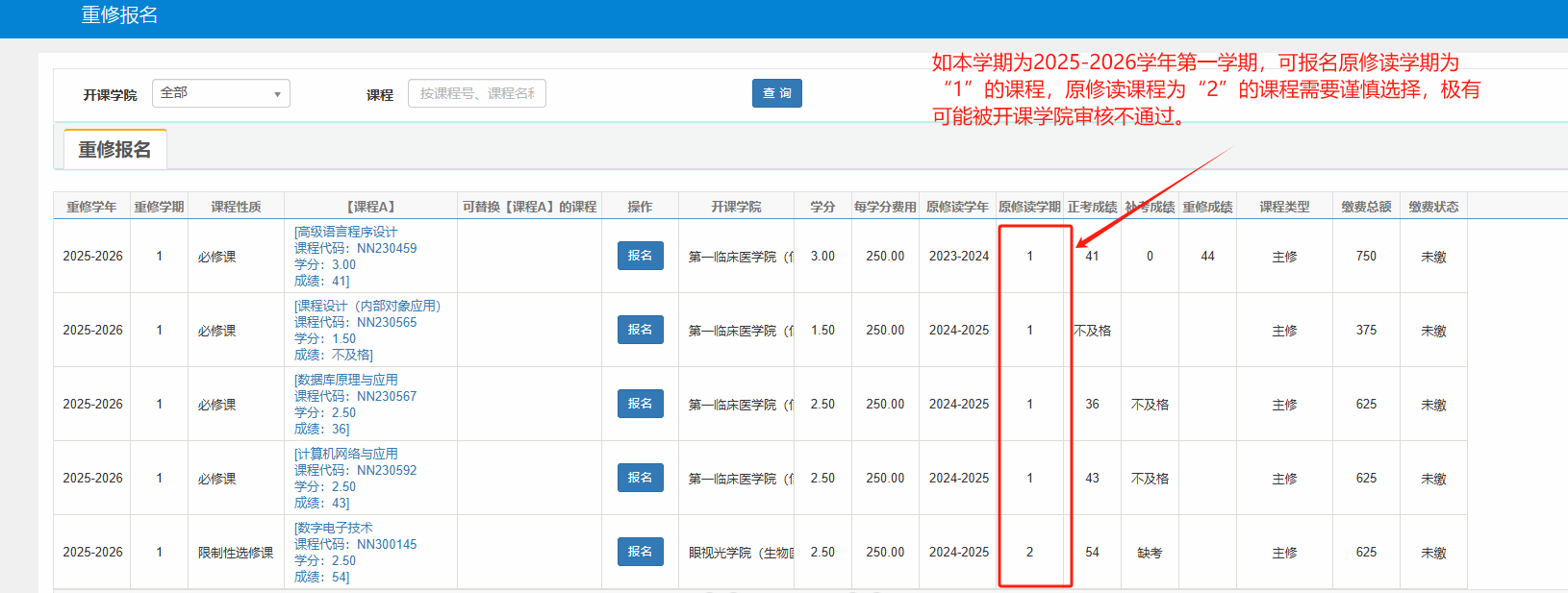 第二步:确认修读学期,当学期应报名原修读学期与本学期一致的课程,例如当学期为2025-2026学年第一学期,则应选择原修读学期为“1”的课程,体育课不限学期,应咨询体育公司,先在体育公司登记重修课程,再在系统内完成报名。